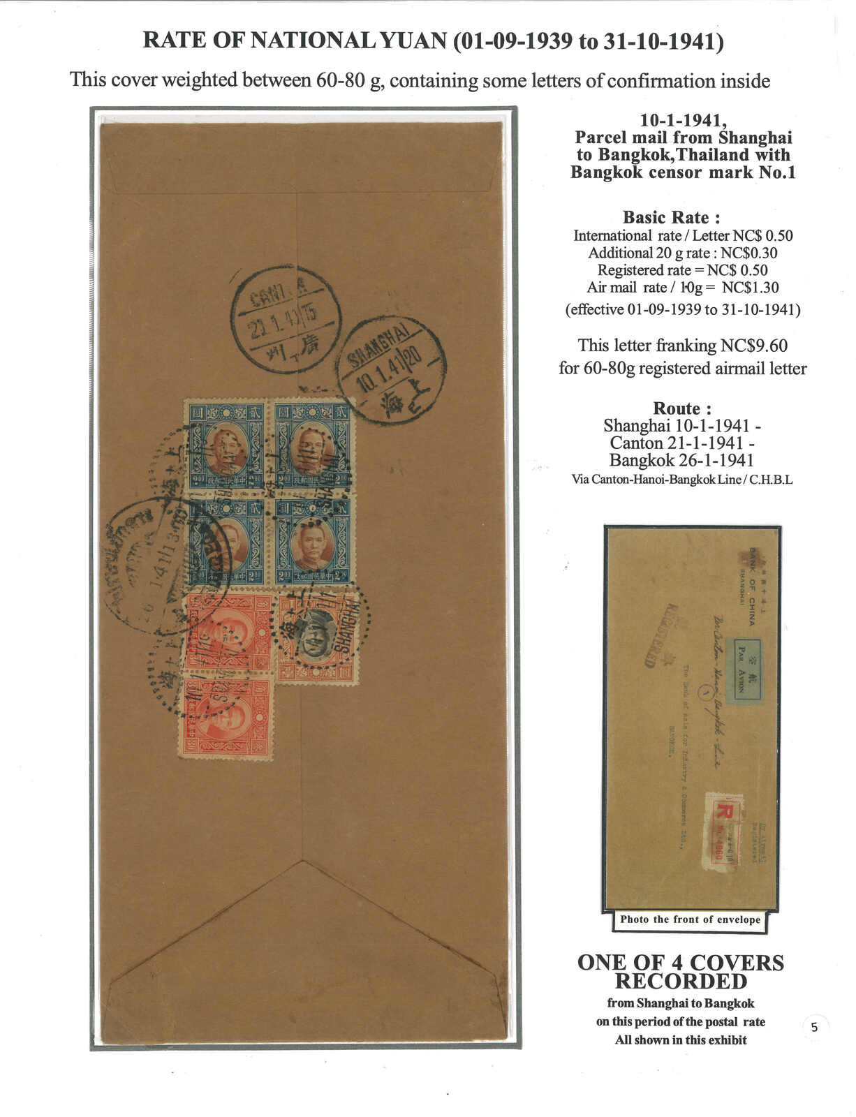 1941.10.10 上海中國銀行寄曼谷亞州商工銀行,背貼孫像3角x3 + 2元四方連,銷上海三格點線日戳。1.21經廣州。正貼掛號、航空標籤、“Per Canton-Hanoi-Bangkok Line”批示及曼谷“1”檢查章。1.26抵曼谷。(Image 1)