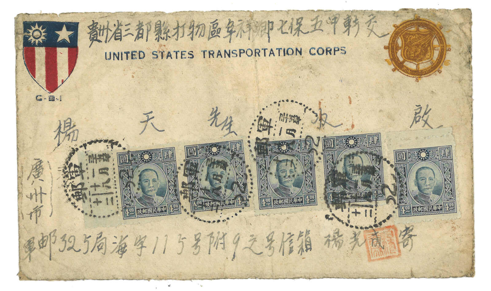 1946.1.18 美國陸軍運輸隊封自貴州寄廣州,貼孫像4元x5,銷軍郵52點線日戳。美國陸軍運輸隊於抗戰中貢獻良多,包括興建滇緬公路。封帶折痕及缺封舌。(Image 1) (Image 2)