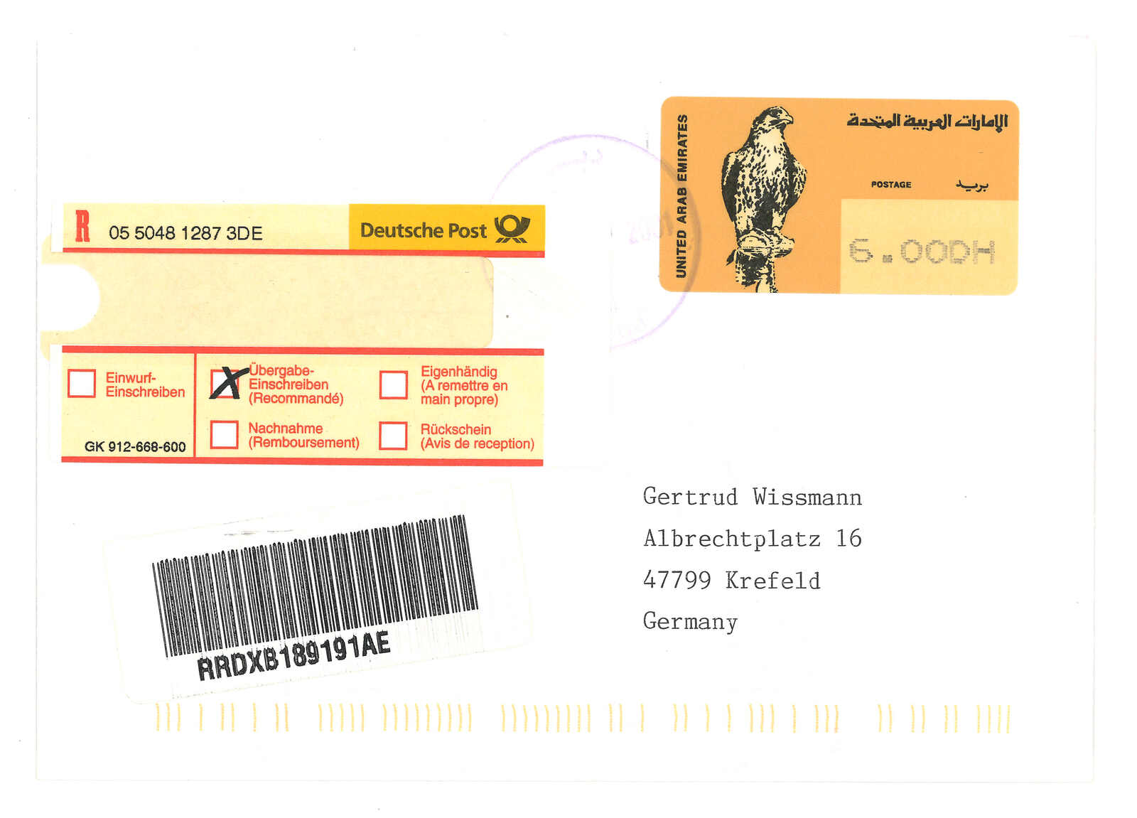 2001.9.15 阿聯酋“獵鷹”5.00迪拉姆電子郵票首日封,寄德國, 銷杜拜日戳。由於機器故障,此票發行不足一個月便告停 售,僅有143枚票存世。自動化集郵之一大珍品。(Image 1) (Image 2)