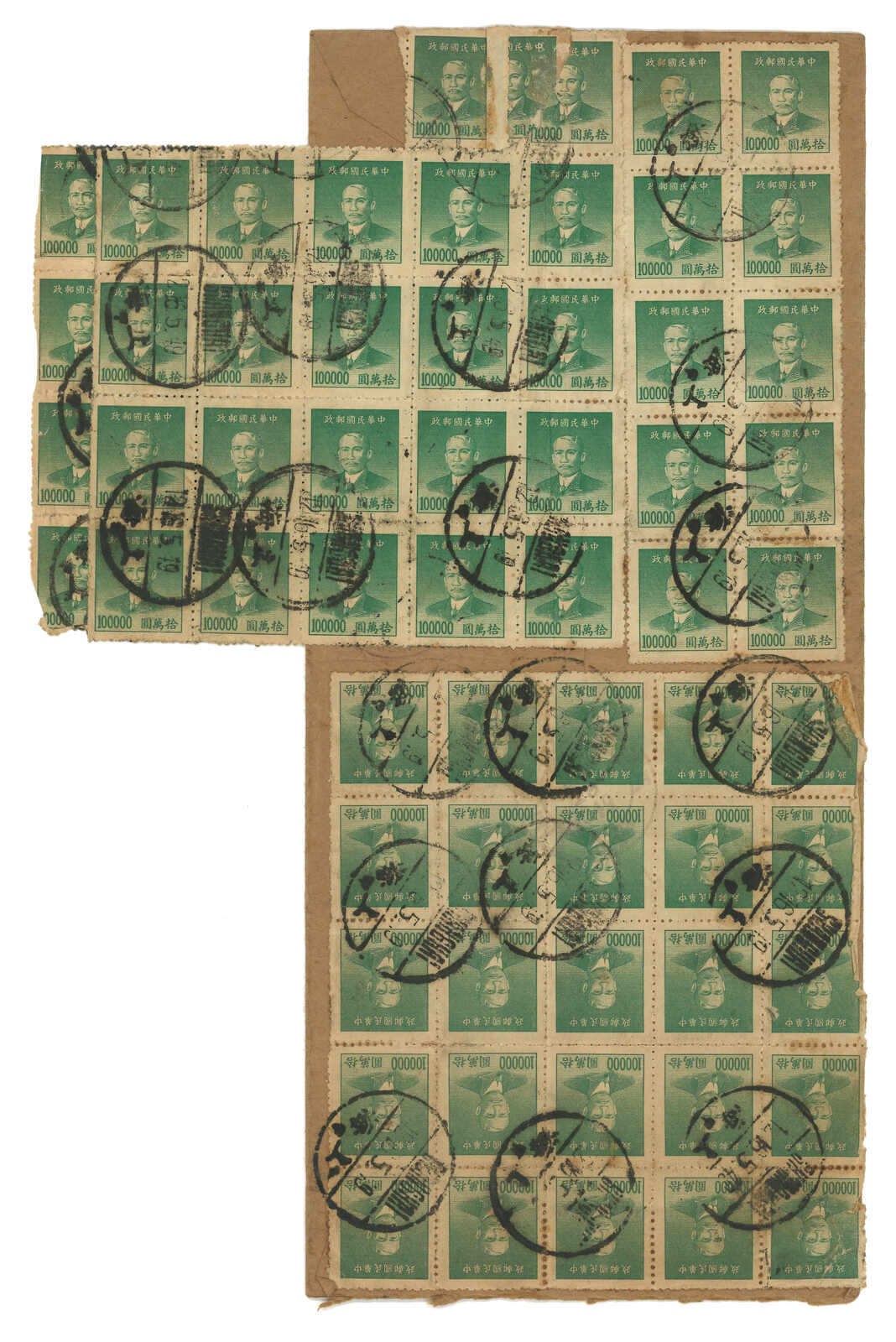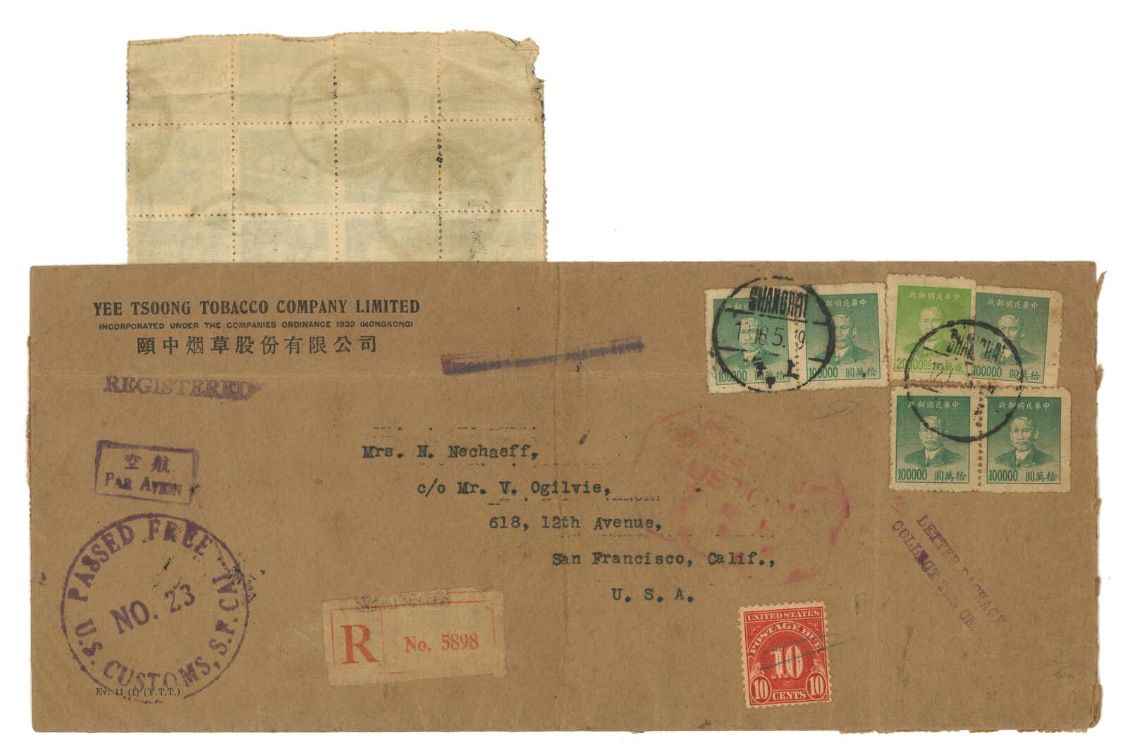 1949.5.16 上海寄美國,正背貼孫像金圓87枚,合862萬元,銷上海三格漢英日戳。正鈐航空章及掛號標籤。應因金圓貶值迅速而在到達後加貼美國欠資票10分,以筆劃銷。蓋有美國海關放行圓戳。銀圓時期貼用金圓票例子,適合郵資研究。(Image 1) (Image 2)