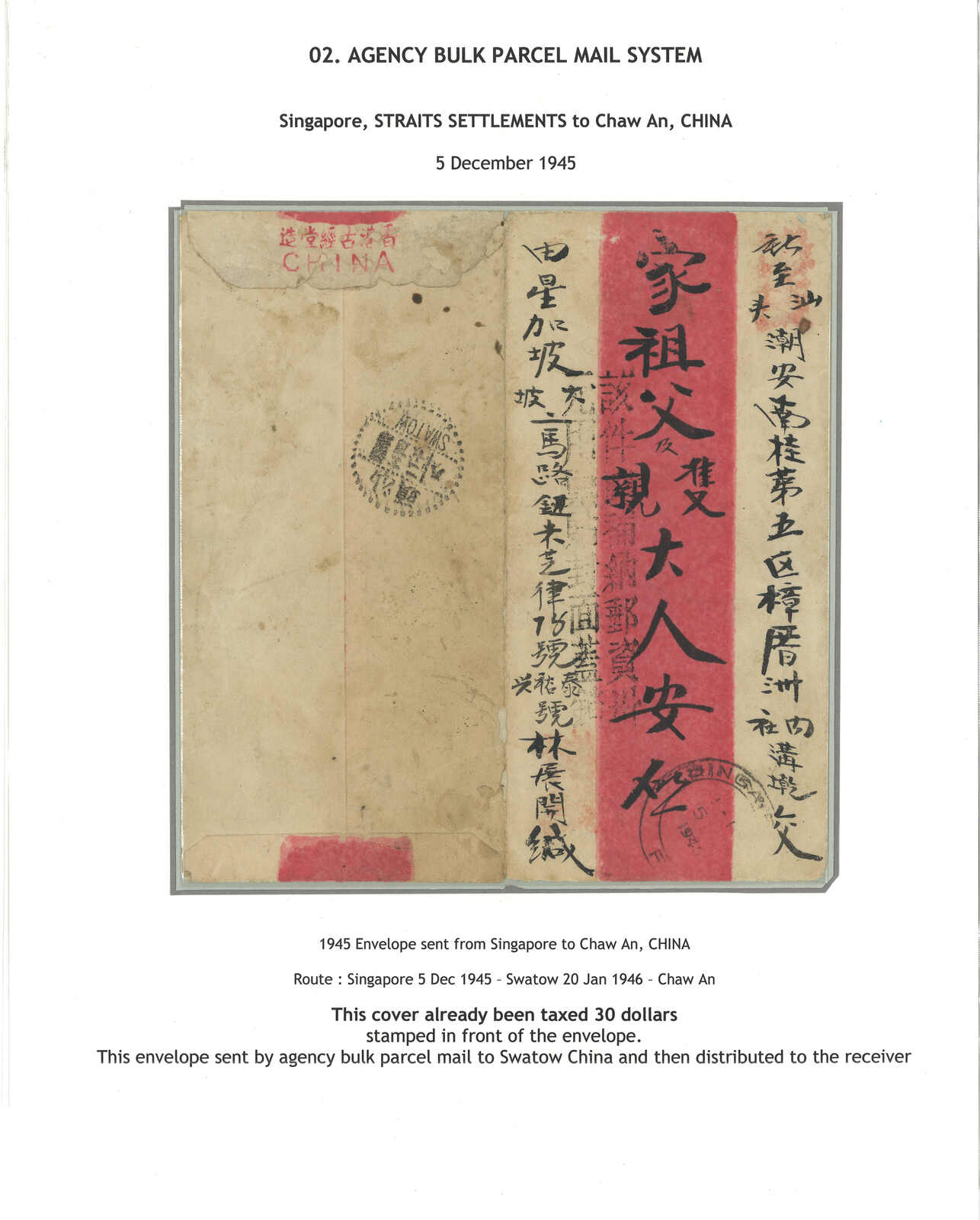 1945 Singapore (5 Dec) to Chowan. Red band cover, frankless, with Singapore origin cds. With "$30 postage was paid / Stamps were affixed on cover and cancelled" but no franking was seen. Arrived Swatow (27 Dec). Interesting and