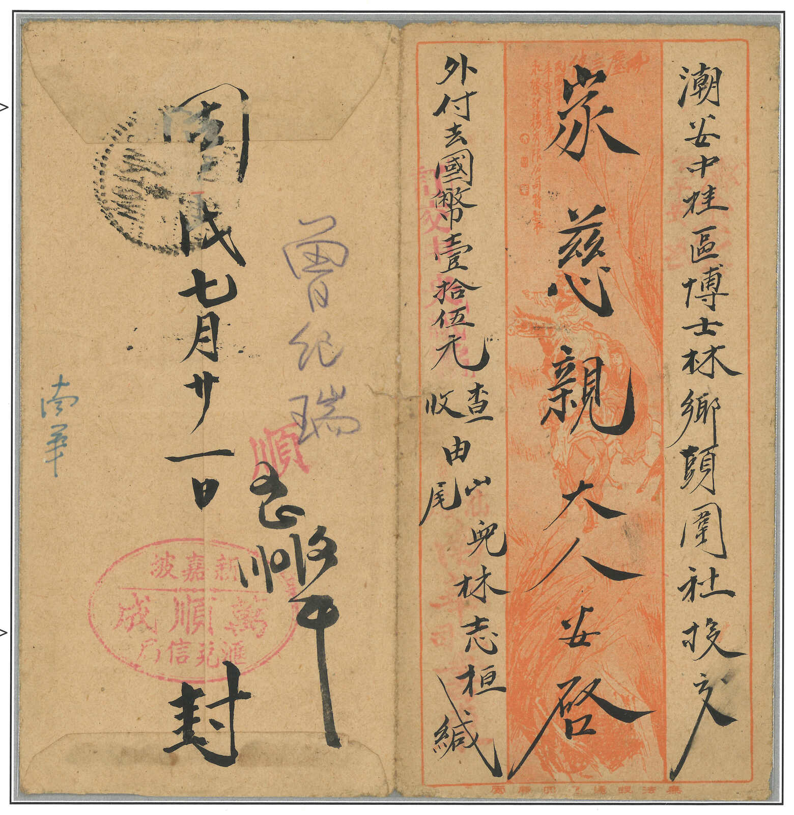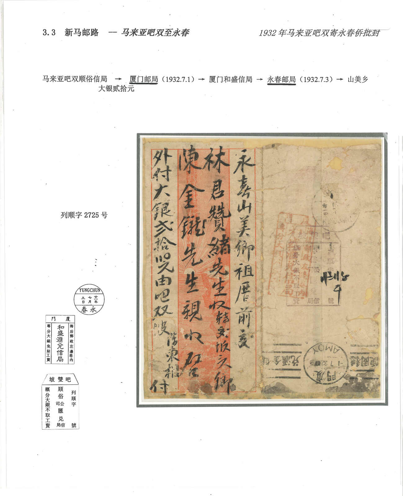 1932年僑批紅條封自巴生寄山美鄉,無貼票,鈐“吧雙坡順俗公司匯兌信局”及“廈門和盛匯兌信局”碑形戳。7.1經廈門。7.3抵永春。封剖開以作展示。(Image 1)