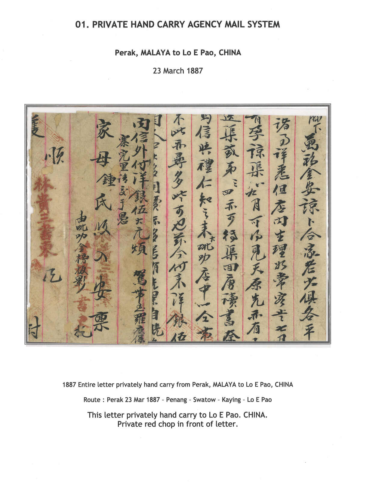 1887 (23 Mar) Qiaopi (money remittance mail) from Perak, Malaya to Loyipu by courier, frankless, with vertical seal of the Qiaopiju. With original letter. Very scarce early example of Qiaopi from Malaya.