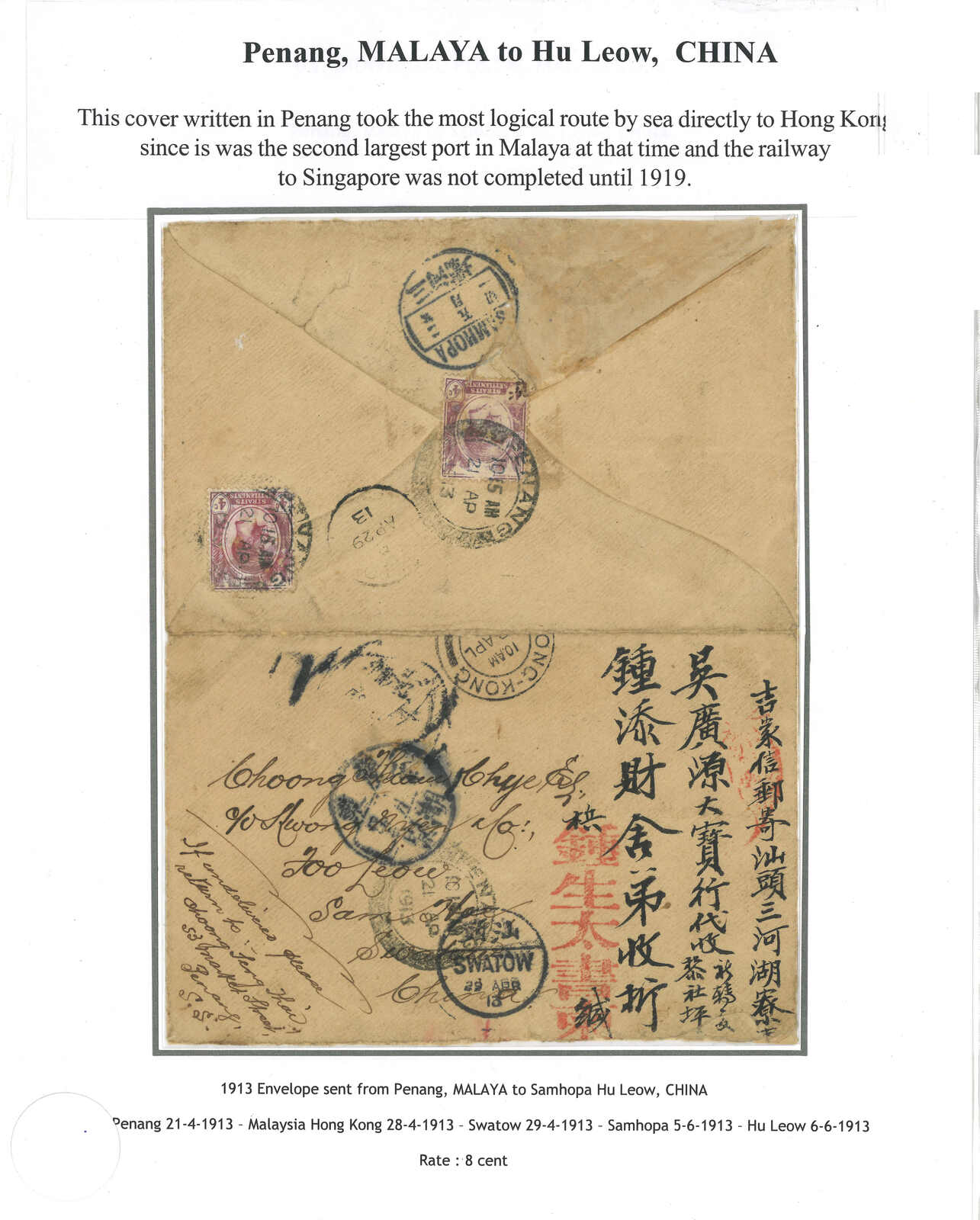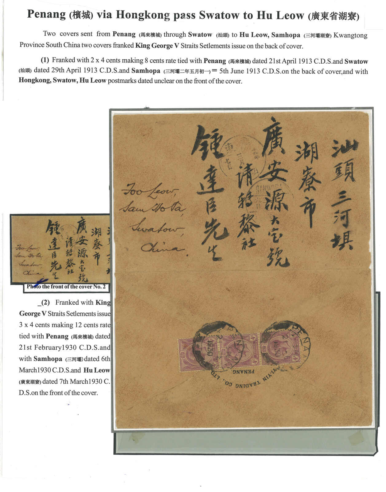 1913 Penang (21 Apr) to Swatow, .f.w Strait Settlement KGV 4c x2 on reverse, tied by Penang cds. Transit Hong Kong (28 Apr), Swatow (29 Apr), Samhopa (1 May). Arrived Huliao (5 May). Cover opened out for display.