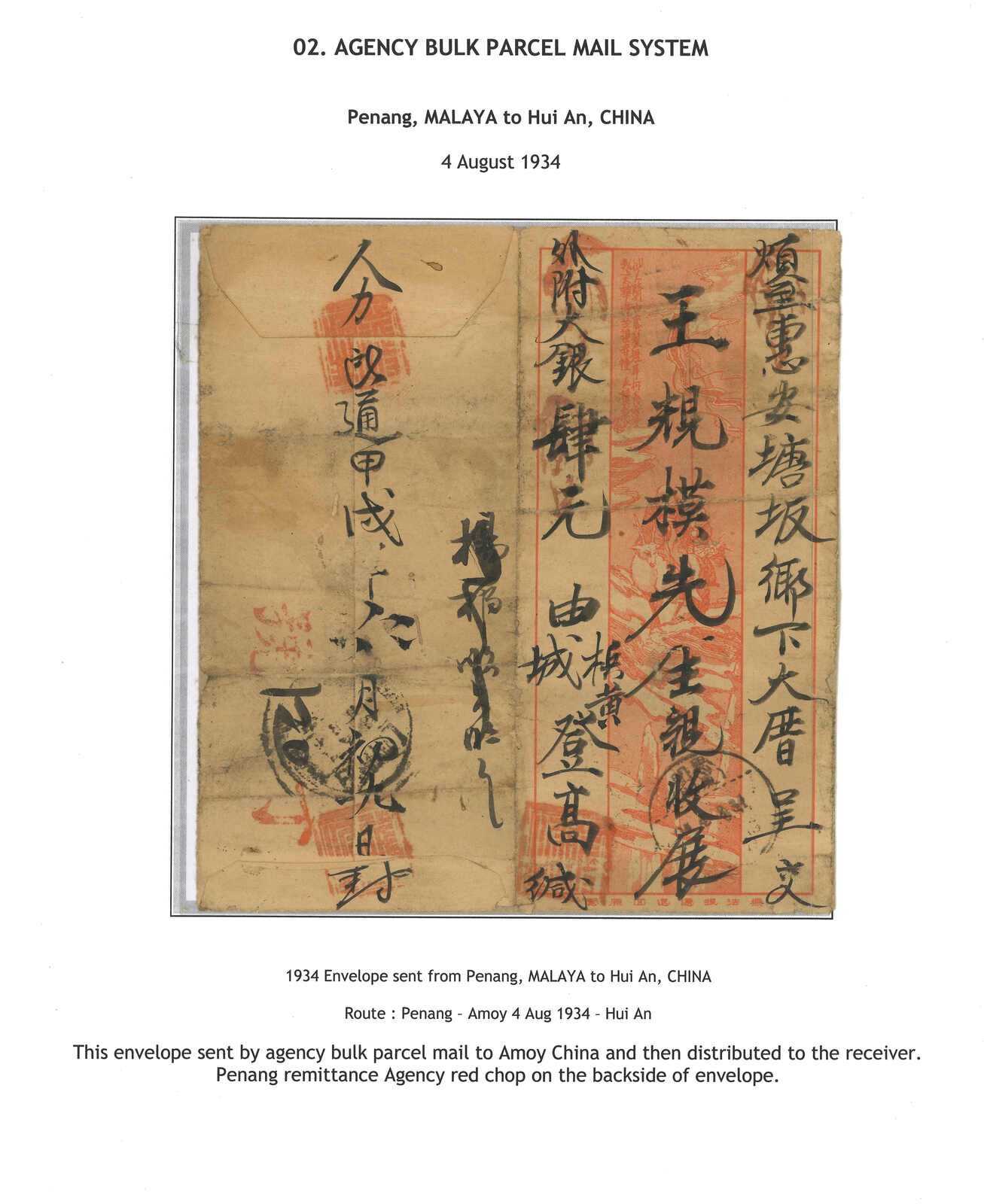 1934 (4 Aug) Qiaopi red band cover (money remittance letter) from Penang to Huian, frankless and carried by bulk mail, applied with Qiaopiju h.s., Loyang Szeming transit cds (4 Aug) on reverse. Loyang cds on Qiaopi is rather
