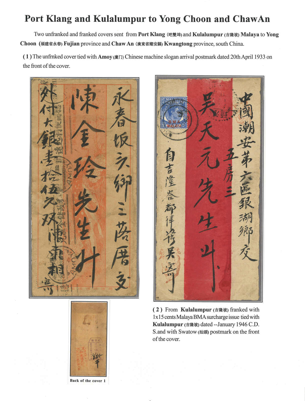 1933 and 1946 a pair of Qiaopi (money remittance letter) from Malaya to China, former from Klang to Yungchun, frankless, applied with Klang Qiaopiju h.s. on reverse while latter from Kuala Lumpur to Chowan, f.w. KGVI ovpt. BMA