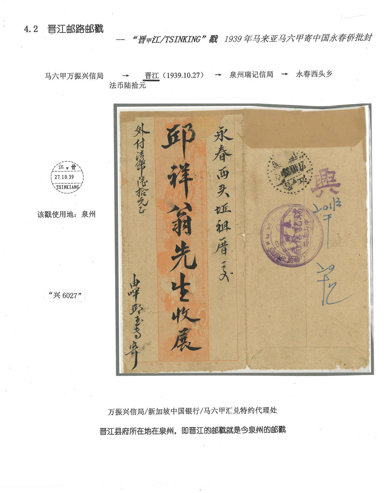 1939年馬六甲寄永春。僑批紅條封,無貼票,鈐“萬橋興”批局圓戳、幫號。10.27抵晉江。封剖開以作展示。(Image 1)