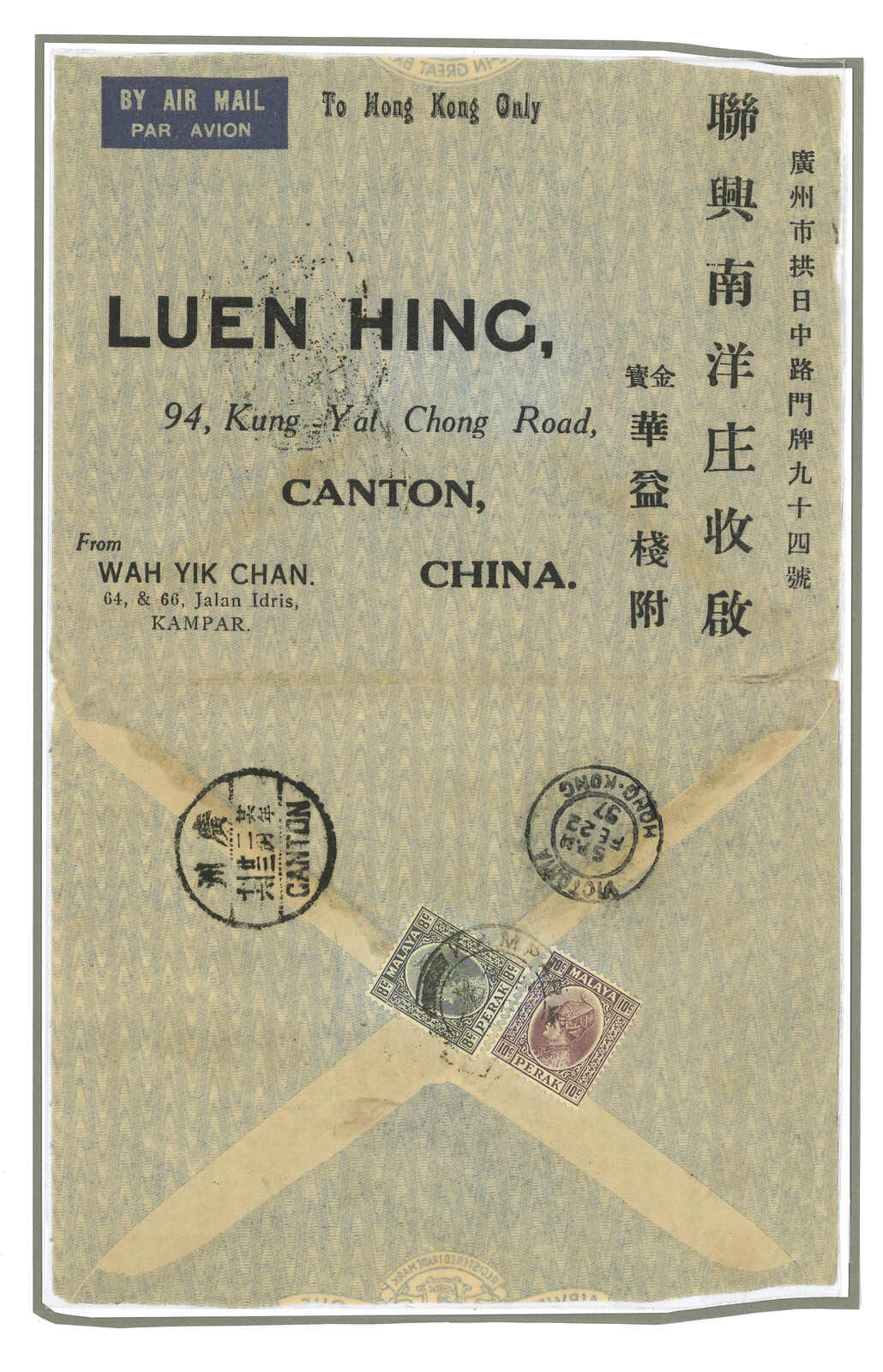 1937 Kampar, Malaya (20 Feb) to Canton, f.w. Perak 10c + 8c on reverse, tied by Kampar cds. Transit Hong Kong (22 Feb). Arrived Canton (23 Feb). Cover opened out for display. Franking of Perak stamps is rather rare on incoming