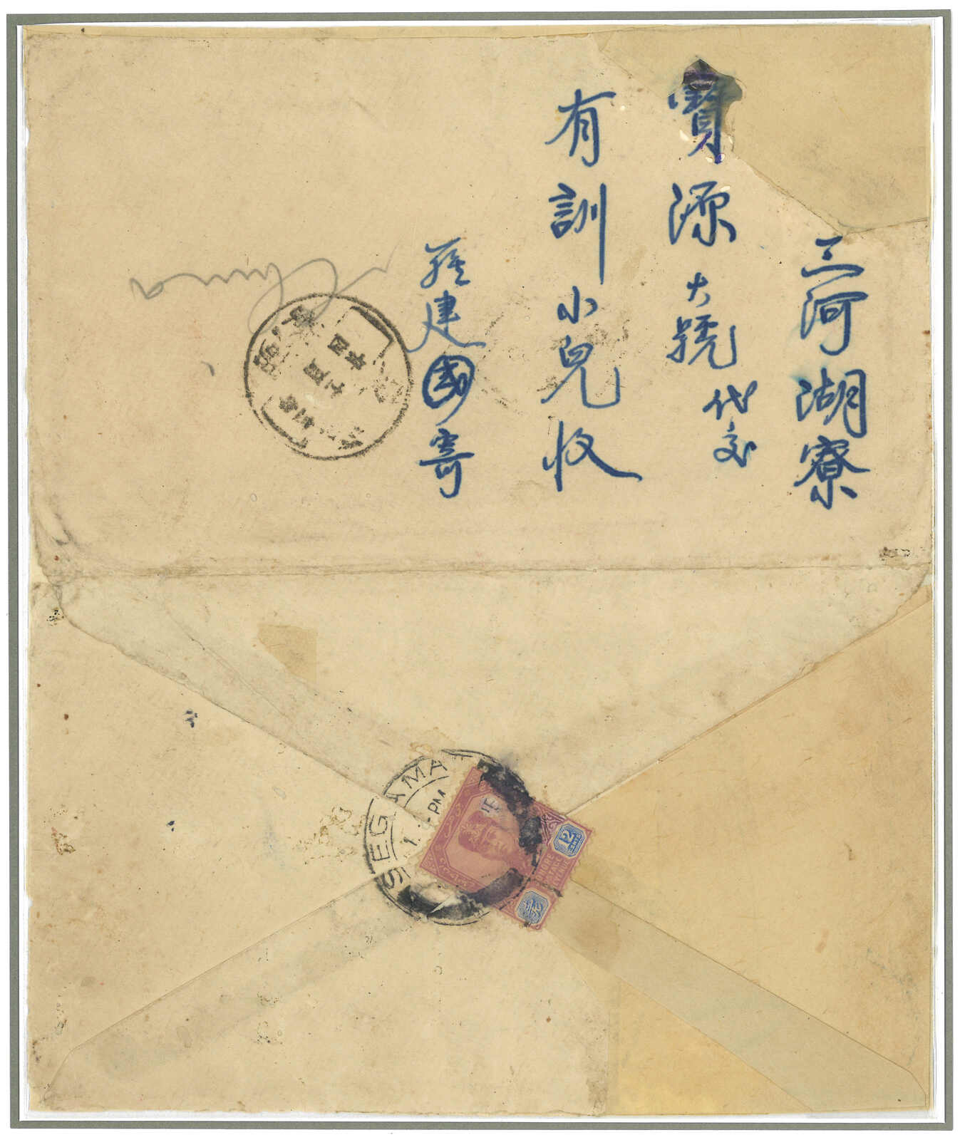 1913.4.21 檳城寄汕頭,背貼海峽殖民地4分x2,銷檳城日戳。4.28經香港,4.29經汕頭,5.1經三河壩。5.5抵湖寮。封剖開以作展示。(Image 1)