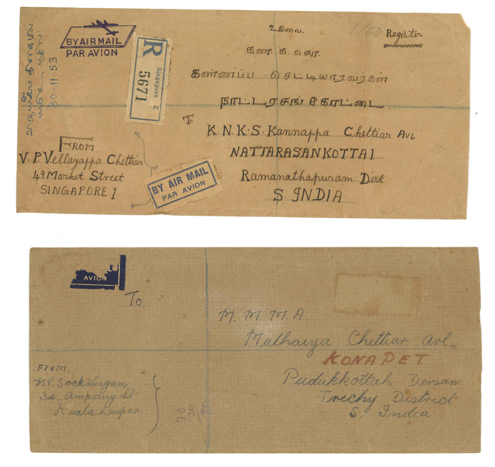 1933及1946年一對馬來亞寄中國僑批。前者貼巴生寄永春,無貼票,鈐“吧雙坡順俗公司”戳記。後者自吉隆坡寄潮安,貼佐治六世加蓋BMA 15分。一對互為對比之例子。(Image 1)
