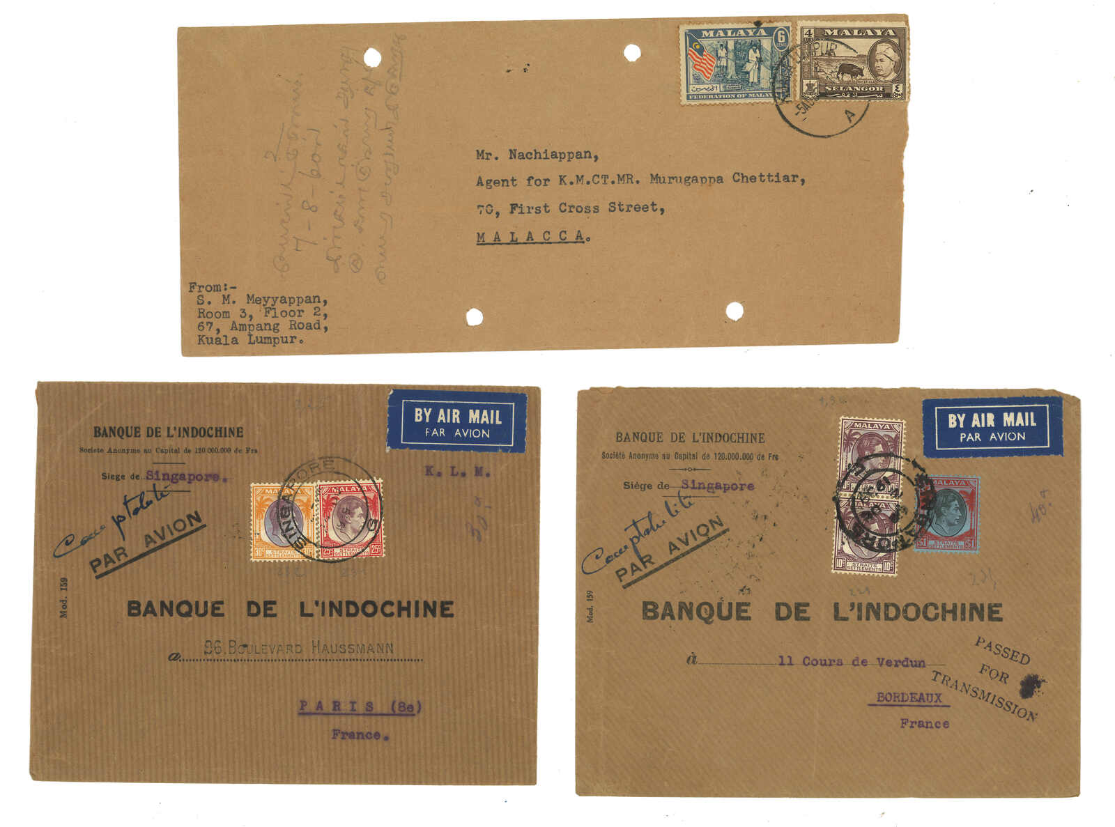 1930-1950s a group of 5 domestic and international covers from Singapore and Kuala Lumpur, f.w. Malaya KGVI or Federation of Malaya issue. Please view.
