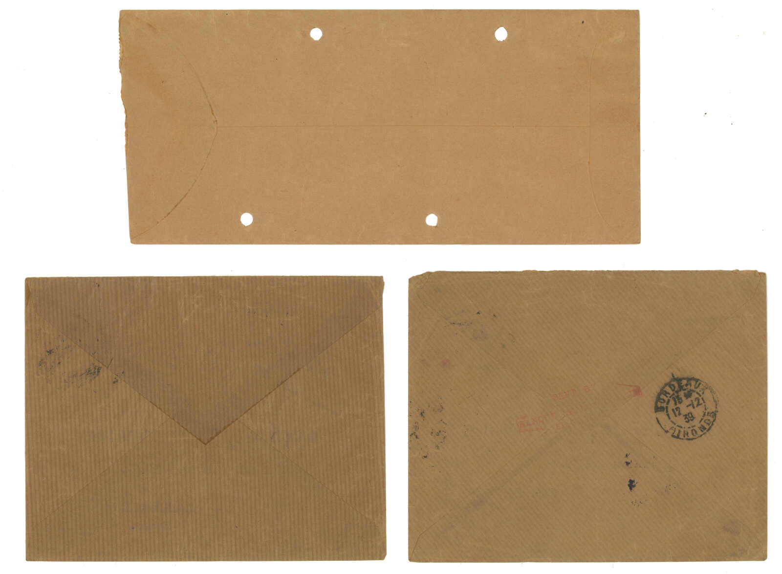 1914 a pair of Qiaopi (money remittance letter) from Penang to Tsungkow by couriers, applied with multiple seals of couriers to avoid confusion. Very scarce. One cover opened out for display.