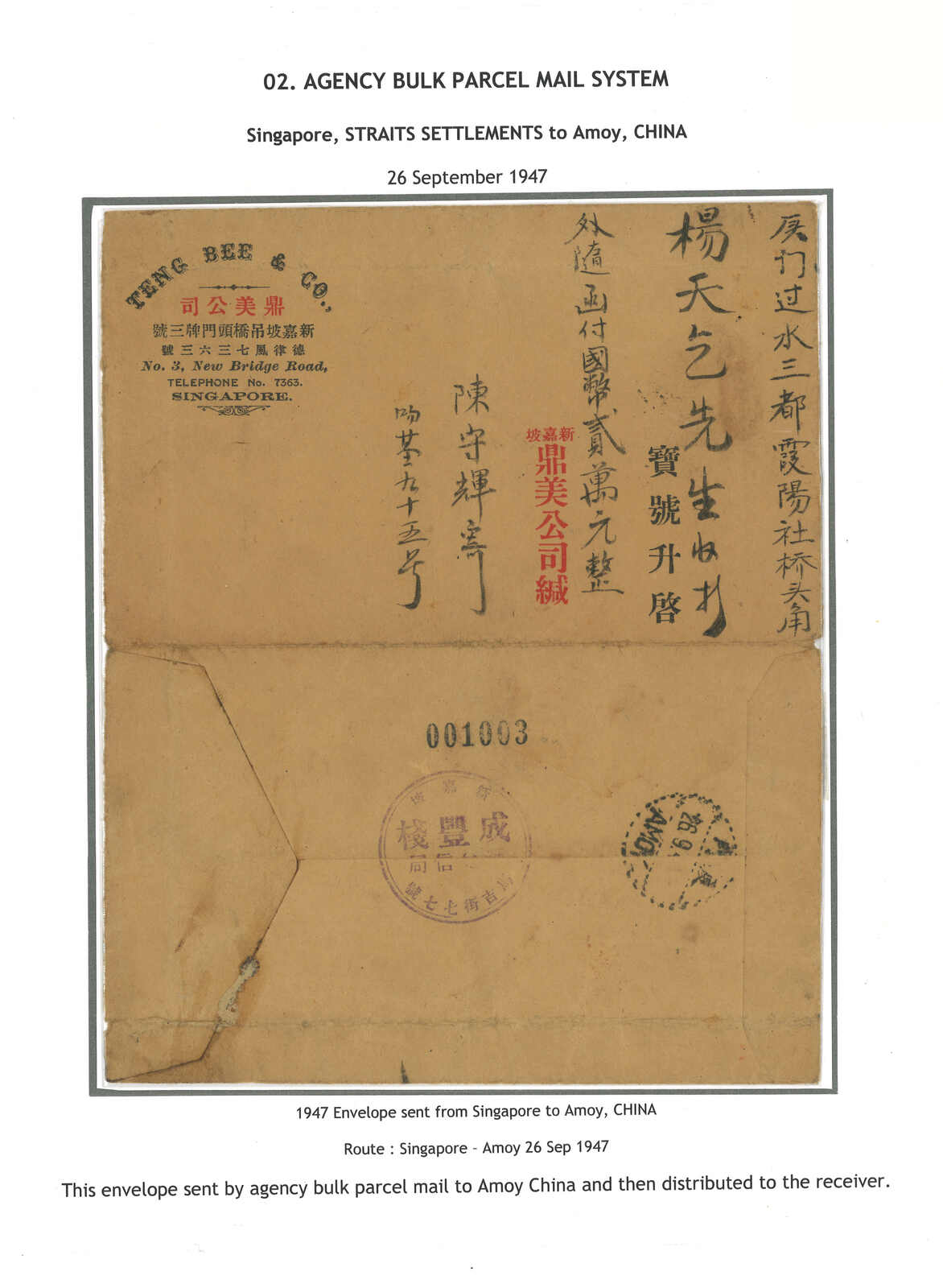 1947 Singapore to Amoy. Teng Bee & Co cover, frankless and carried in bulk mail, applied with Singapore Qiaopiju circular seal. Arrived Amoy (26 Sep). Cover opened out for display.