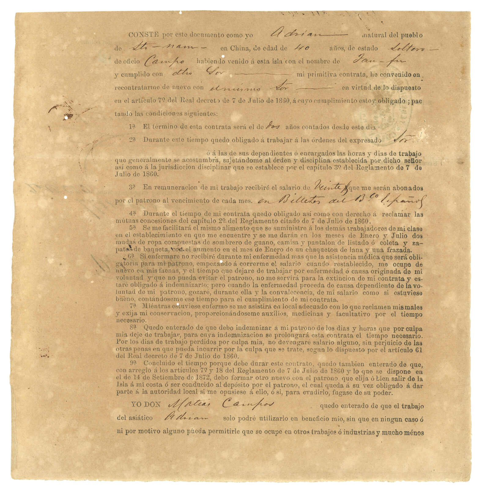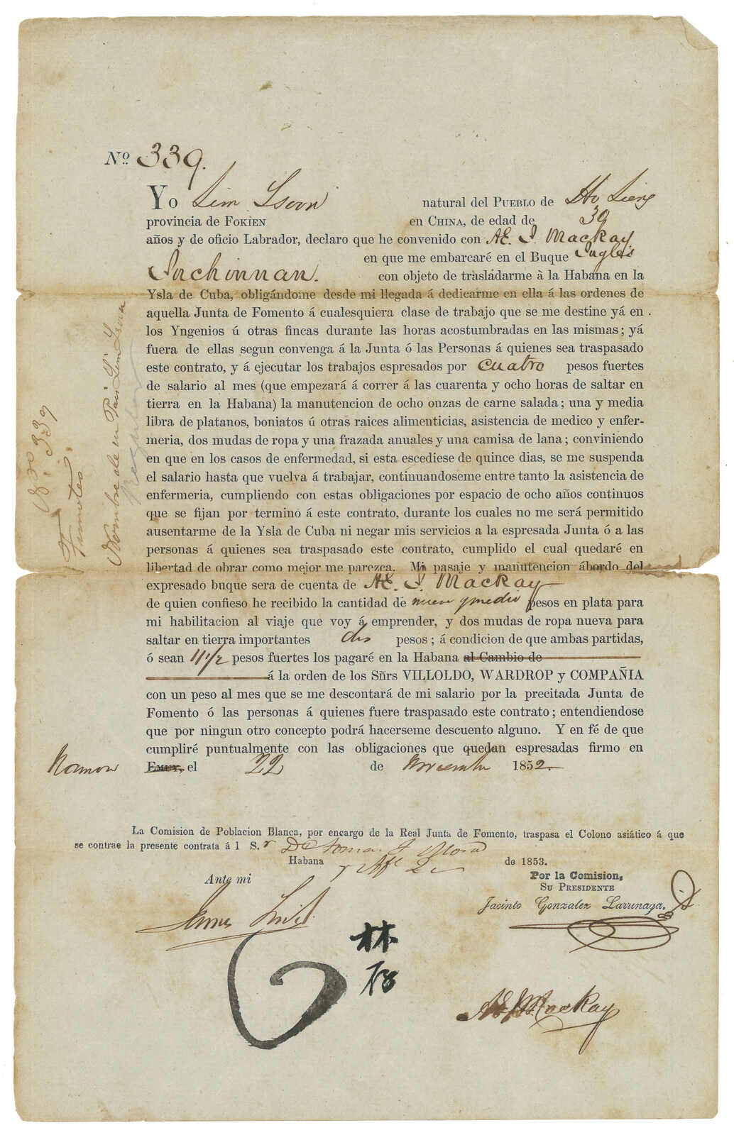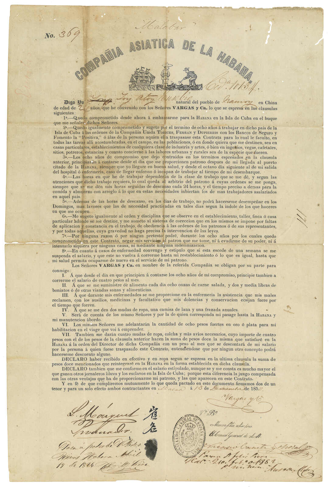 1859 "Compania Asiatica de la Habana" employment contract of a Chinese worker in Cuba, printed in both Chinese and Spanish and signed in Macao, recording the name, age of the worker as well as terms and salary. Historical. With