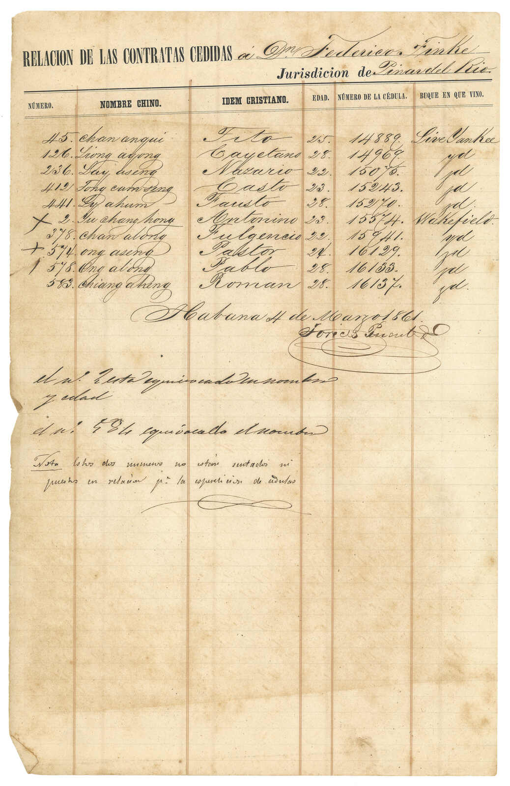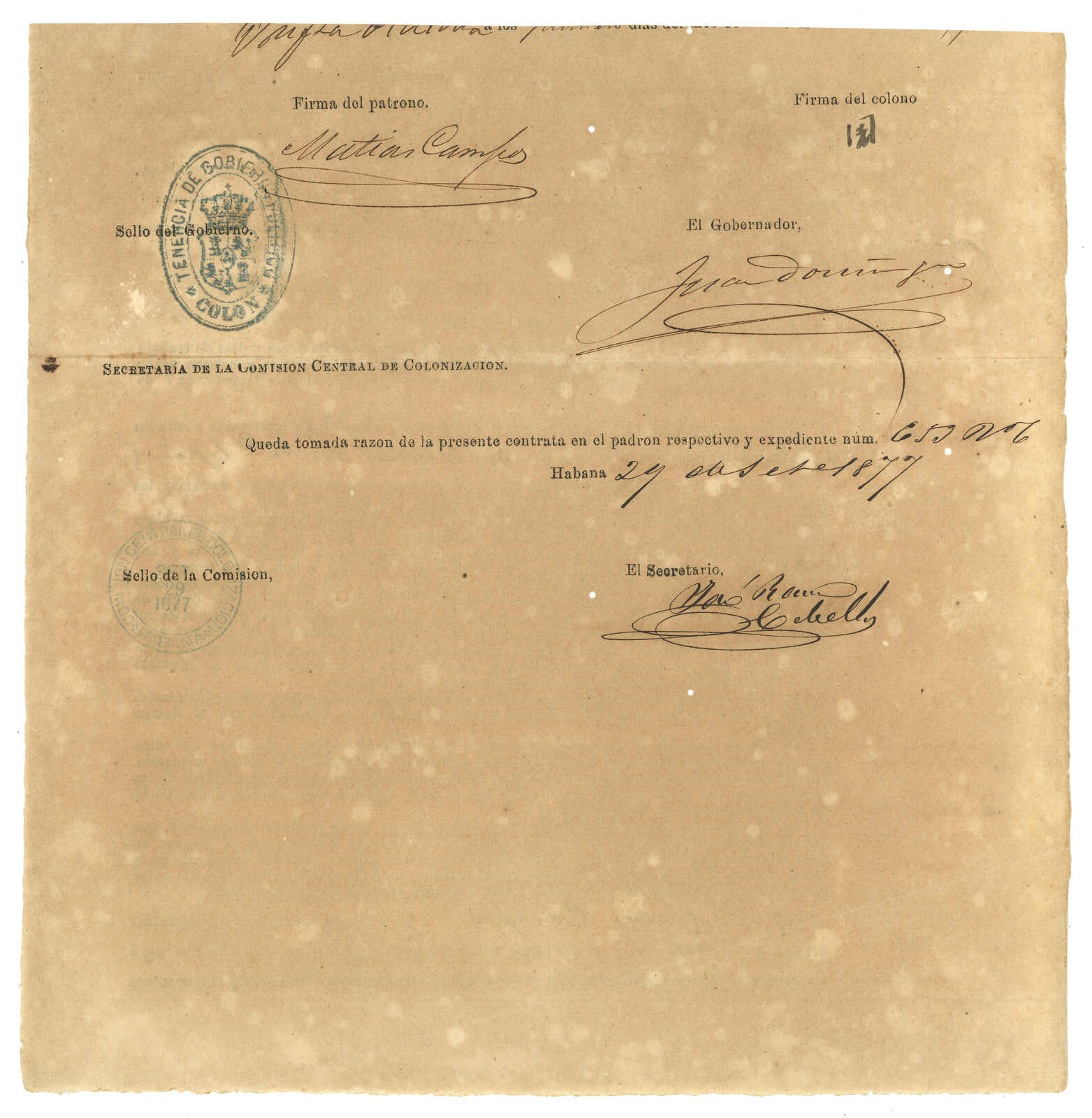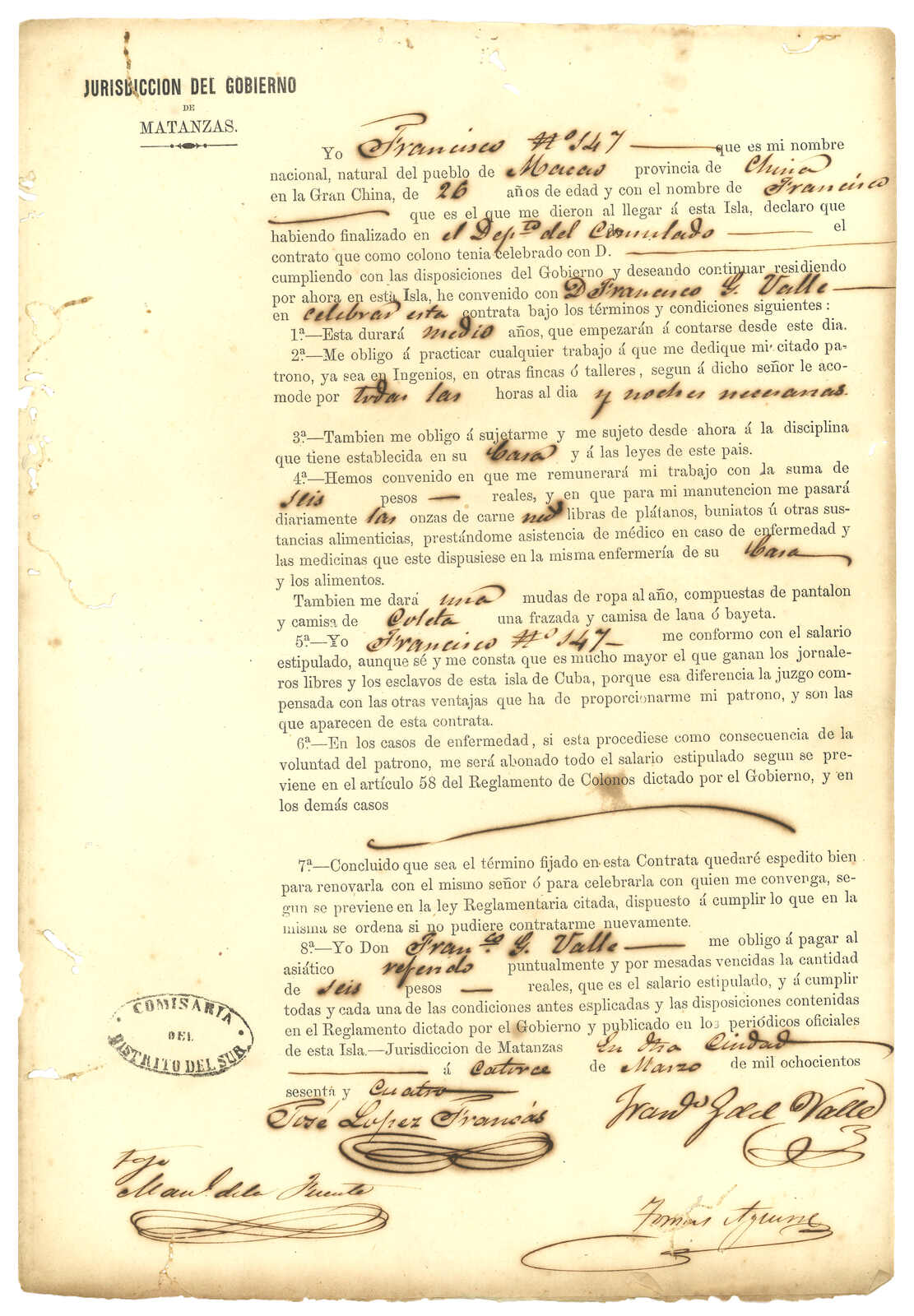 1859 "Compania Asiatica de la Habana" employment contract of a Chinese worker in Cuba, printed in both Chinese and Spanish and signed in Macao, recording the name, age of the worker as well as terms and salary. Historical. With