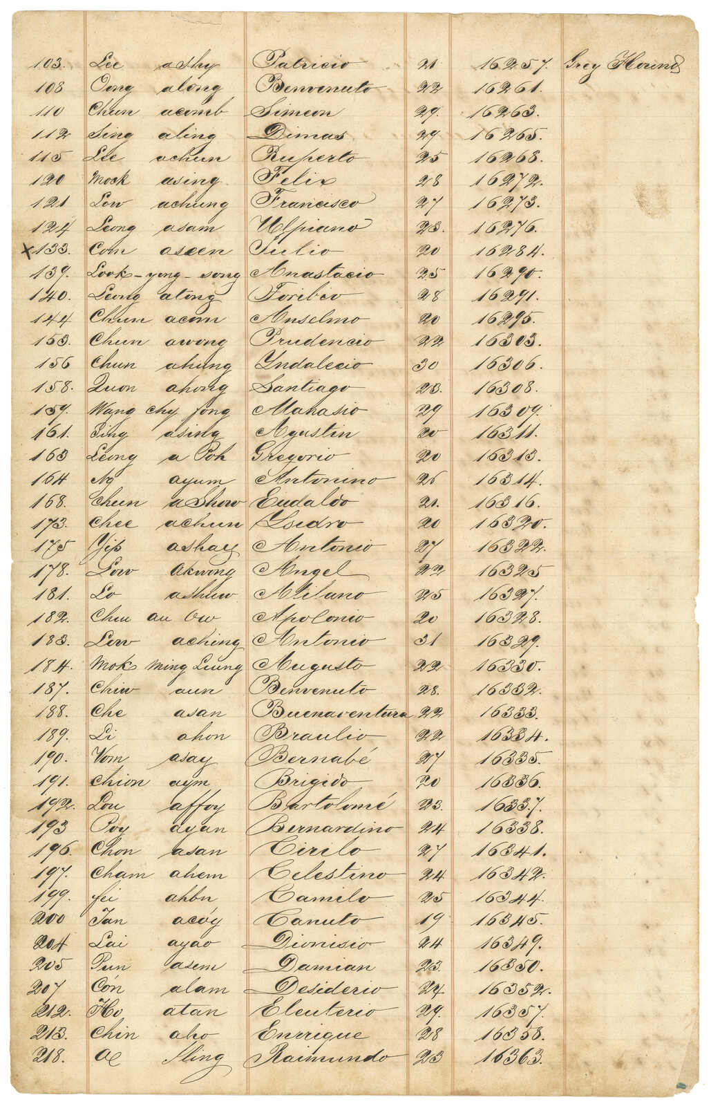 約1850年代兩份古巴華工名單,記錄了華工之姓名、年齡及編號。帶折痕。深具歷史意義。(Image 1)