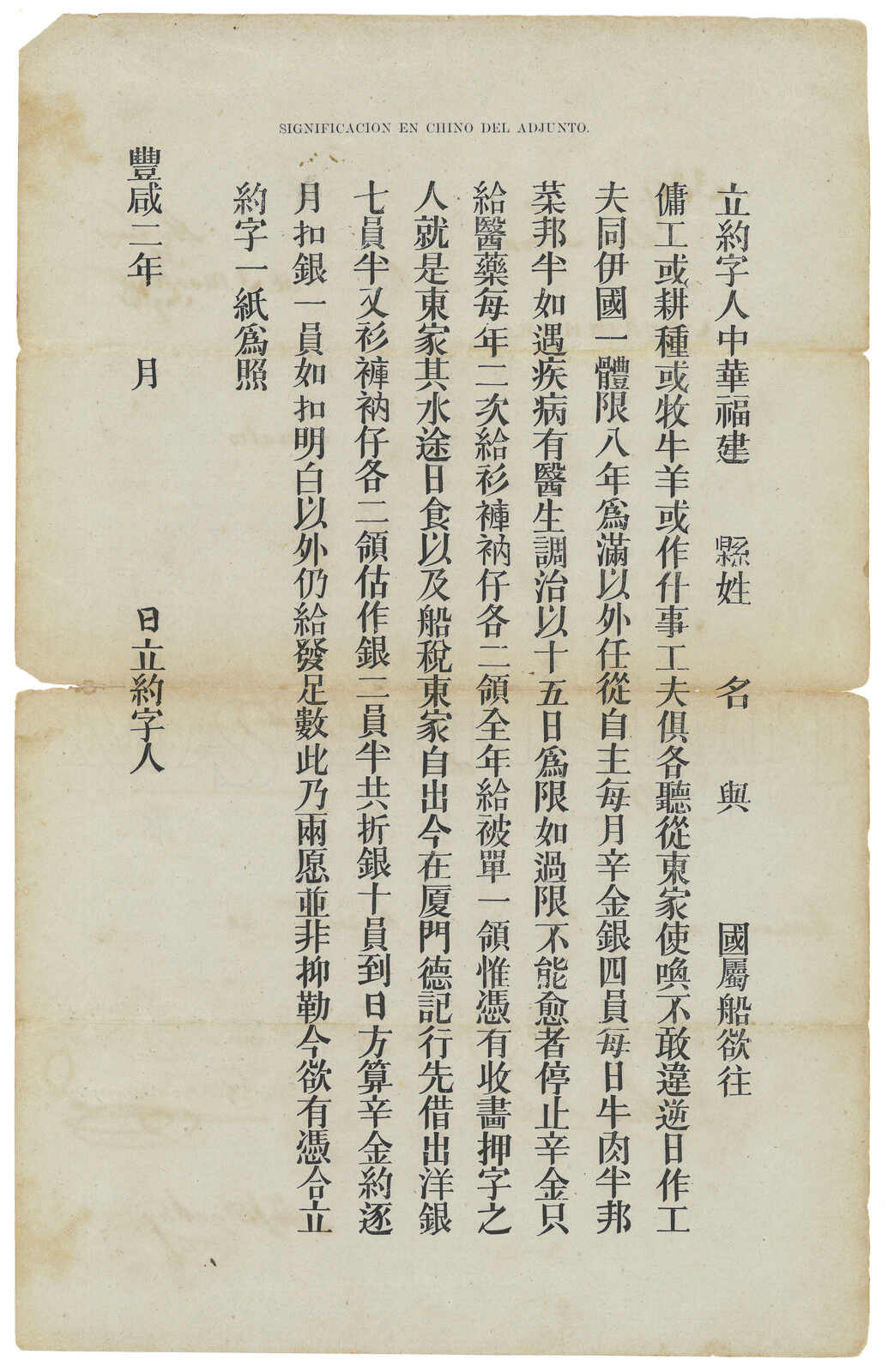 1852 Employment contract of a Chinese worker in Cuba, printed in both Chinese and Spanish, recording the name, age of the worker as well as terms and salary. Historical. With folds and creases.