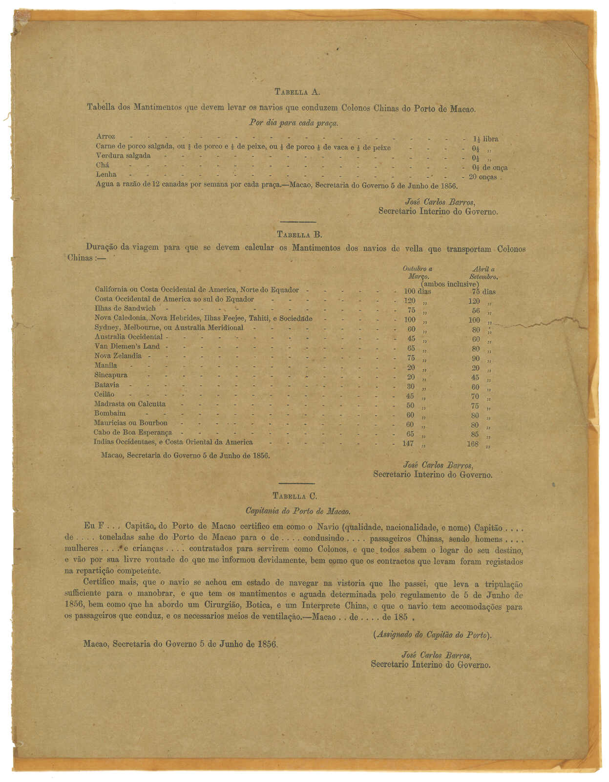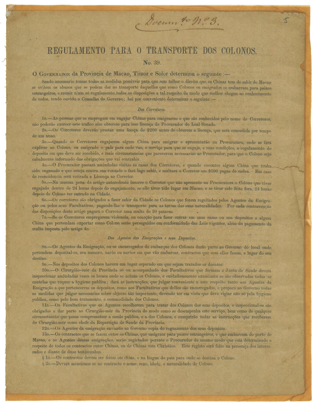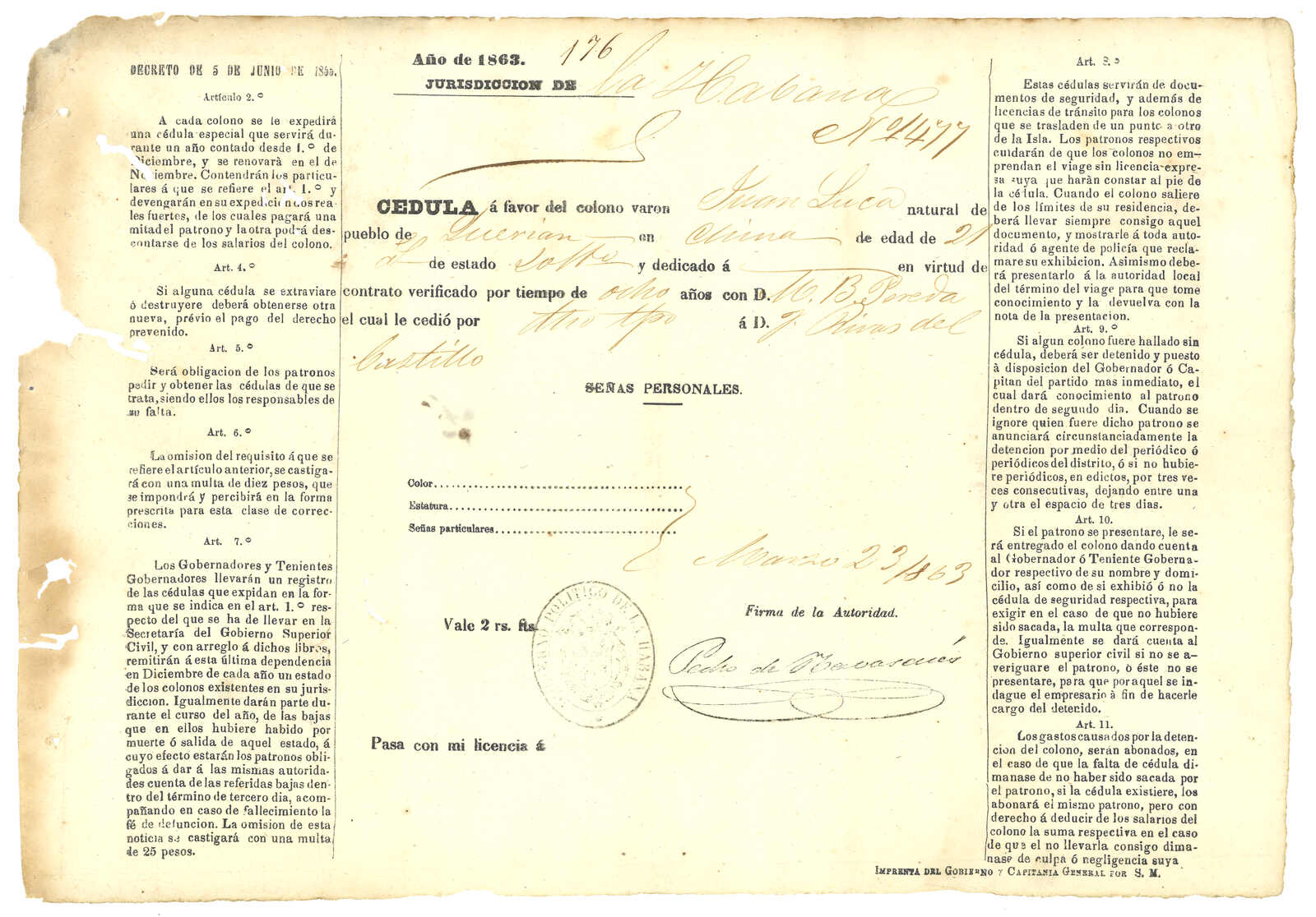 1860s a pair of ID document for Chinese worker in Cuba and regulation of transport of settlers, both in Spanish, reflecting the life of Chinese workers in Cuba. Historical. With folds and wormholes.