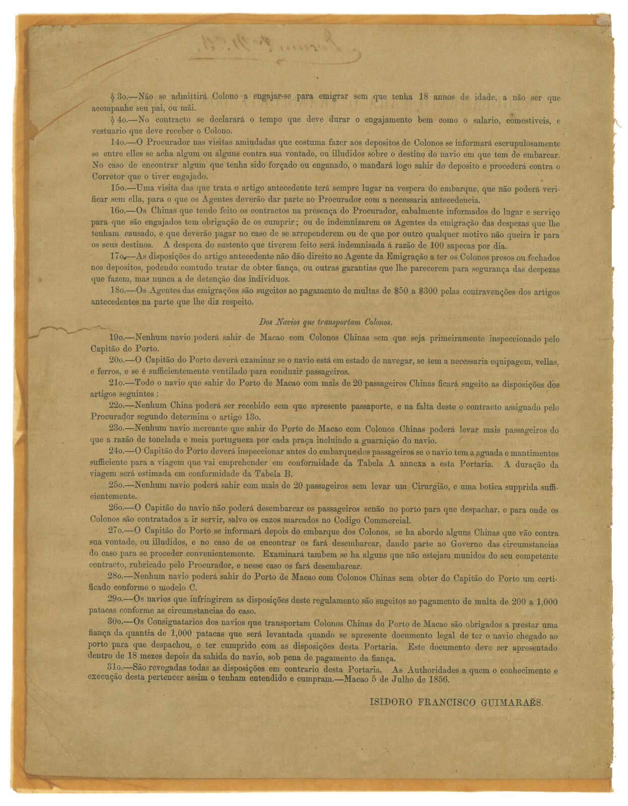 1860年代古巴華工身份證明文件及“運送外來定居者之規定”各一份,均以西 班牙印刷,反映了古巴華工之生活。帶有折痕及蟲蛀。深具歷史意義。(Image 1)