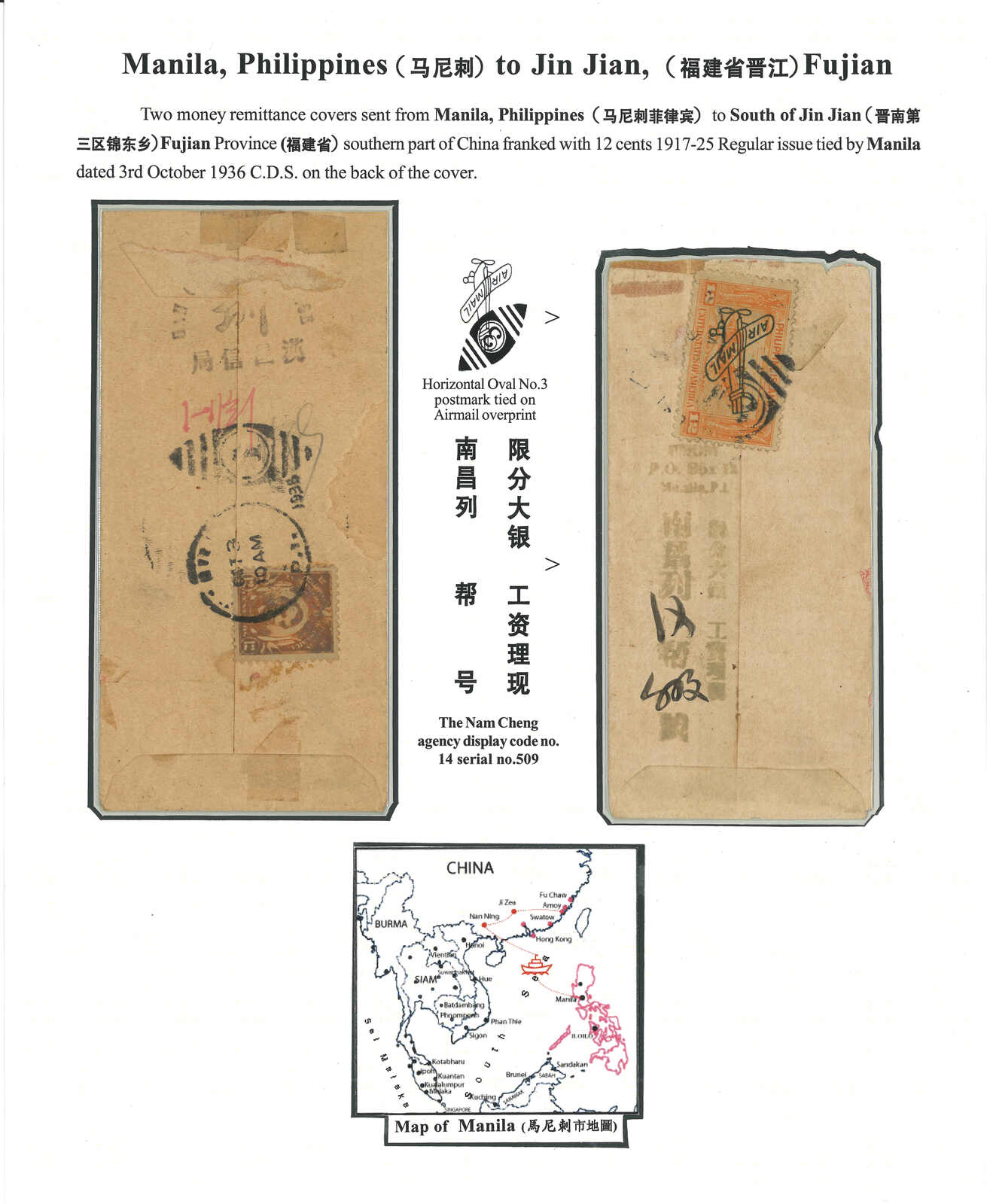 1941年一對馬尼拉寄晉江之僑批,均貼菲律賓票12分。前者鈐漢昌信局戳記,後者鈐“南昌列14幫509號”戳記,反映於太平洋戰爭期間經南寧中轉,為少見之廣西中轉封。後者為2008年版許茂春著《東南亞華人與僑批》第178頁3-38原件。(Image 1)