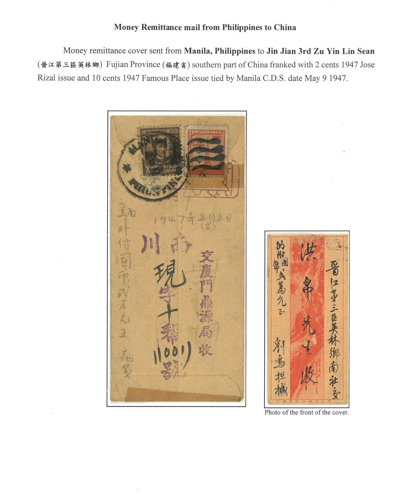 1947 (9 May) Qiaopi (money remittance letter) from Manila to Tsinkiang, f.w. FIlipino Jose Rizal 2c + Famous Place 10c, tied by Manila d.s., alongside with Amoy Qiaopiju vertical cachet and number.