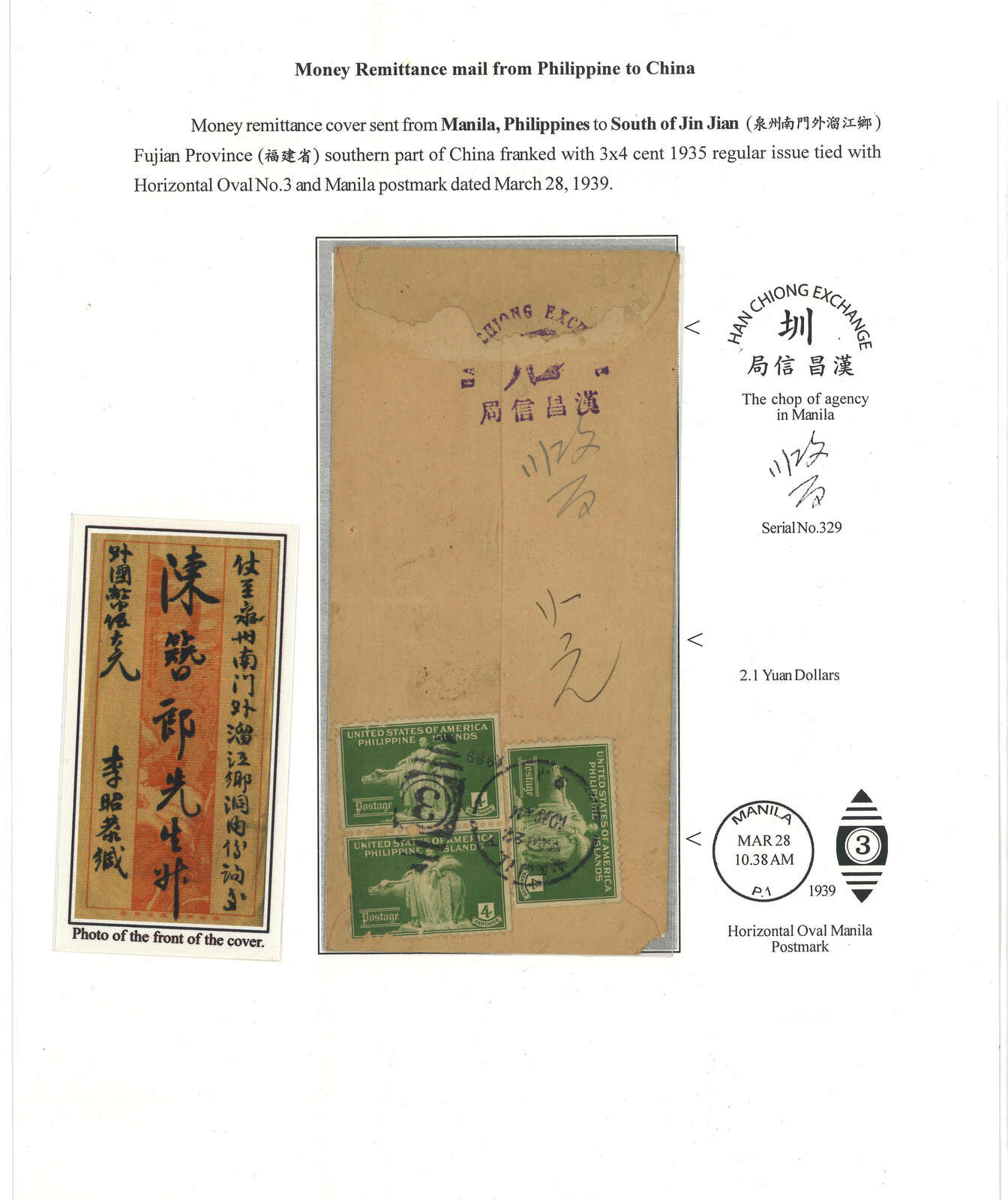 1939 (28 Mar) Qiaopi (money remittance letter) from Manila to Liukiang, f.w. Filipino 4c x3 on reverse, tied by Manila duplex d.s, alongside with Han Chiong Exchange h.s. and serial number.