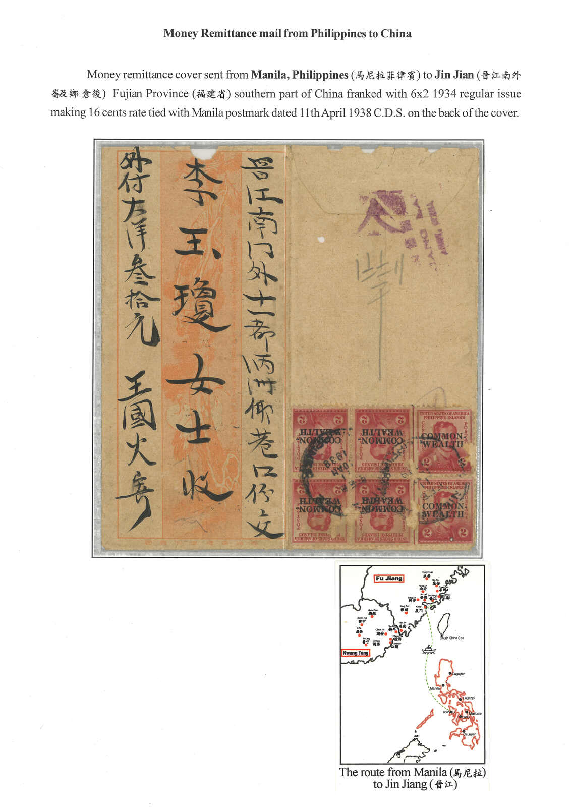 1938 (11 Apr) Qiaopi (money remittance letter) from Manila to Tsinkiang, f.w. FIlipino ovpt. Commonwealth 2c in block of 6 on reverse, tied by Manila cds., alongside with Han Chiong Exchange h.s. and serial number. Cover opened