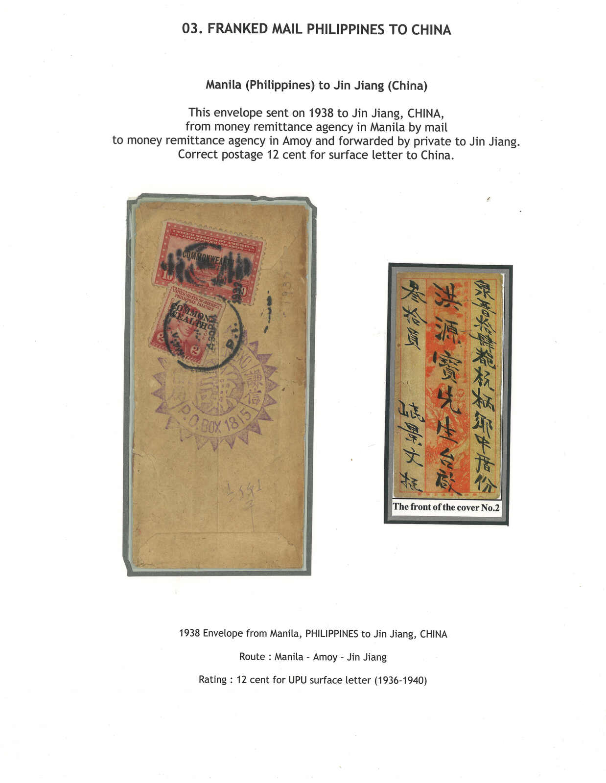 1938年馬尼拉寄晉江。僑批紅條封,背貼菲律賓票加蓋Commonwealth 2分 + 10分,銷馬尼拉雙聯日戳,旁鈐“謙信信局”戳記。2008年版許茂春著《東南亞華人與僑批》第179頁3-44原件。(Image 1)