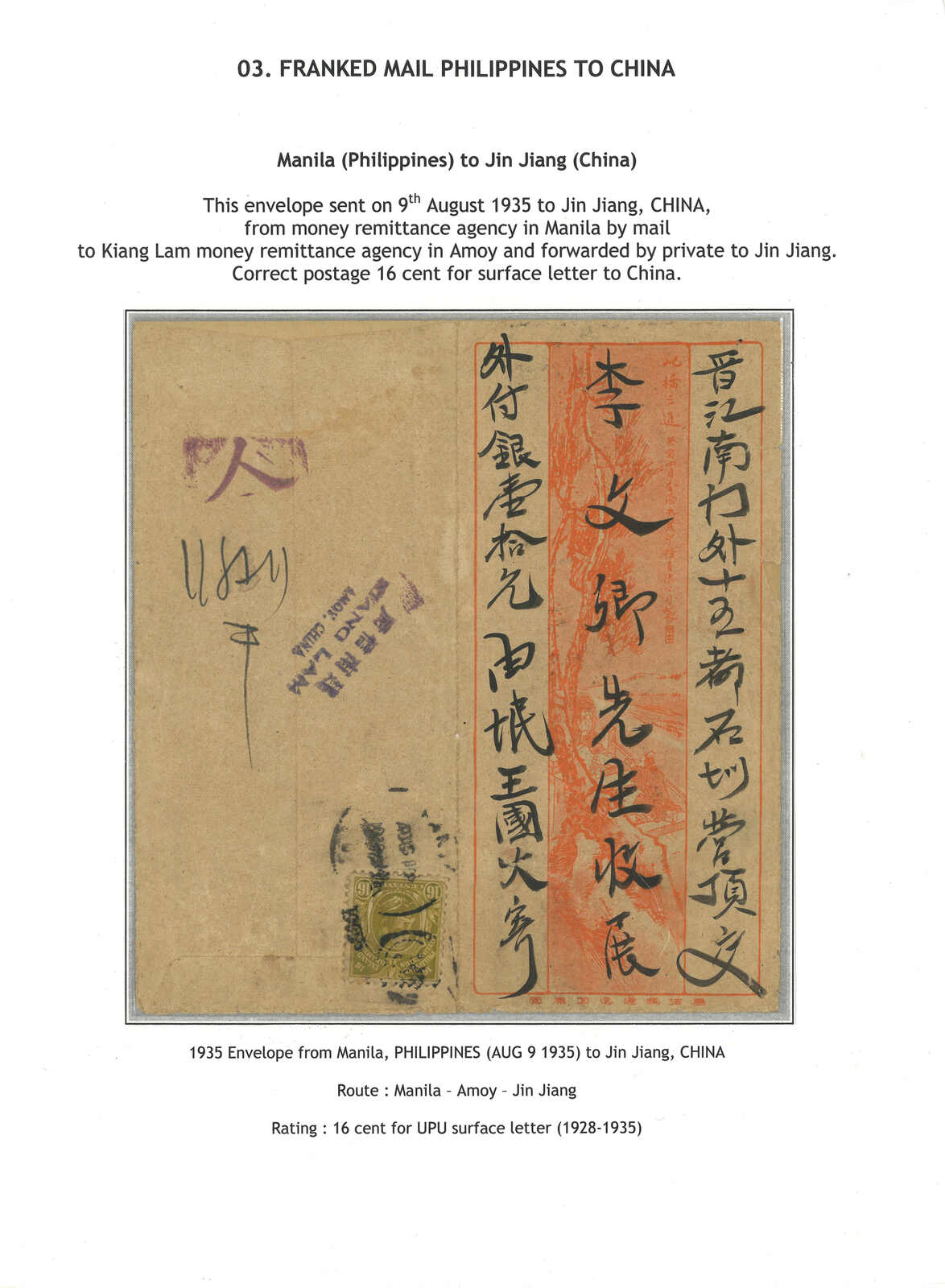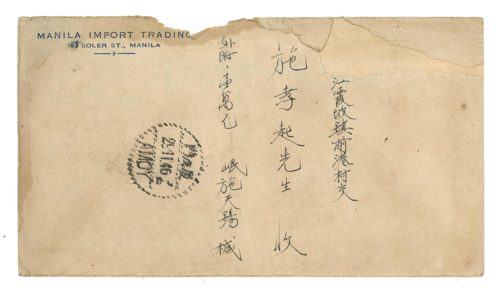 1935 (9 Aug) Qiaopi (money remittance letter) from Manila to Tsinkiang, f.w. Filipino 16c on reverse, tied by Manila duplex d.s., alongside with Qiaopiju seal and serial number. Cover opened out for display.