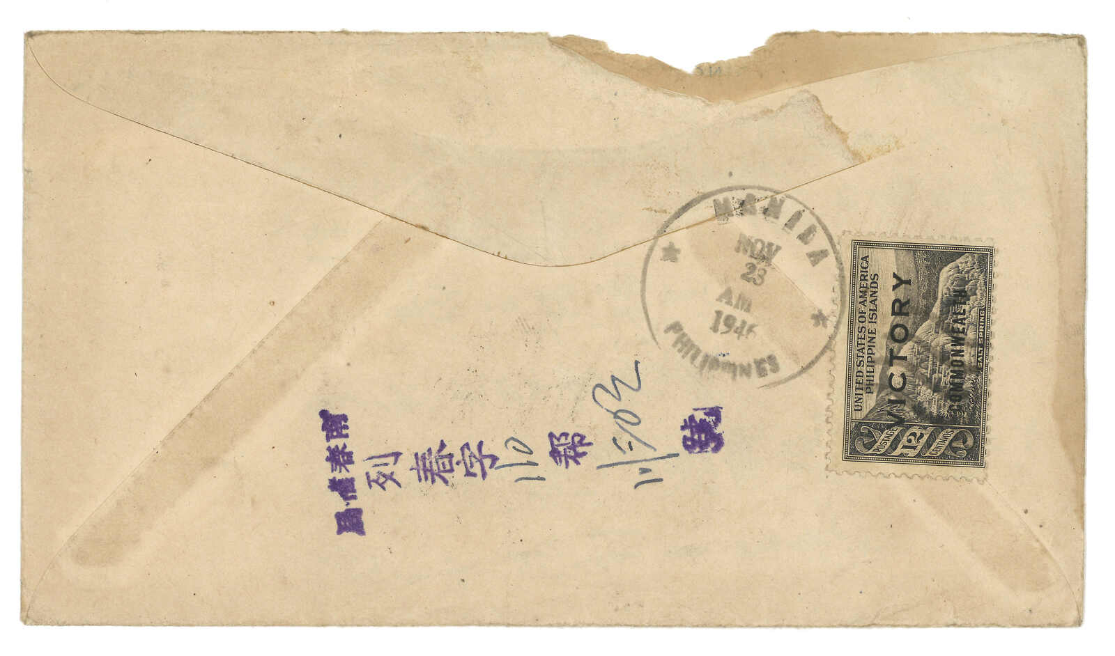 1946 Manila (23 Nov) to Amoy, f.w. Filipino ovpt. Victory 12c on reverse, tied by Manila duplex d.s. and vertical seal fo Qiaou with serial number. Arrived Amoy (29 Nov). Cover damaged at top right.