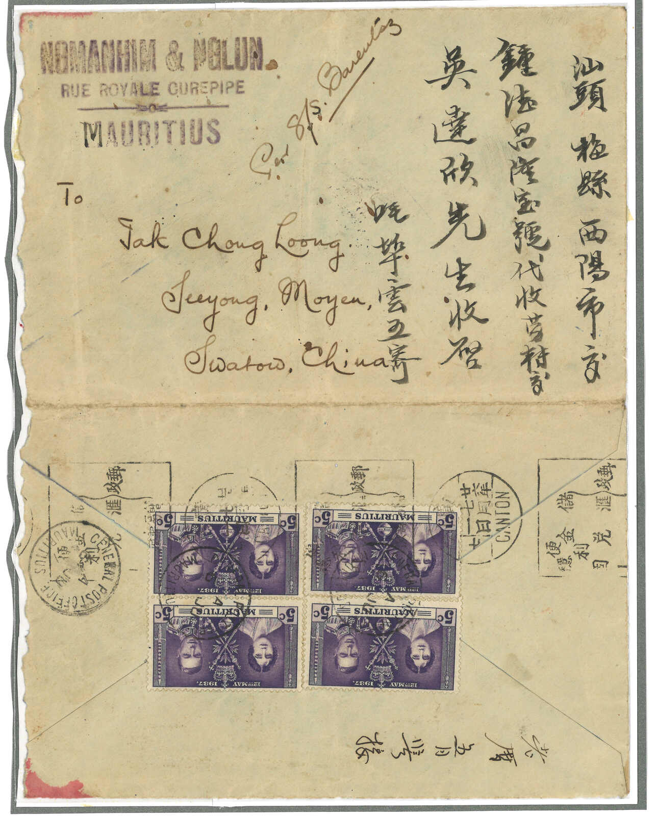 1937.9.7 毛里求斯寄梅縣,貼毛里求斯佐治六世加冕票5分x4,銷中央郵局日戳。10.20經廣州,鈐貯金宣傳機戳。少見之毛里求斯始發地。封剖開以作展示。(Image 1)