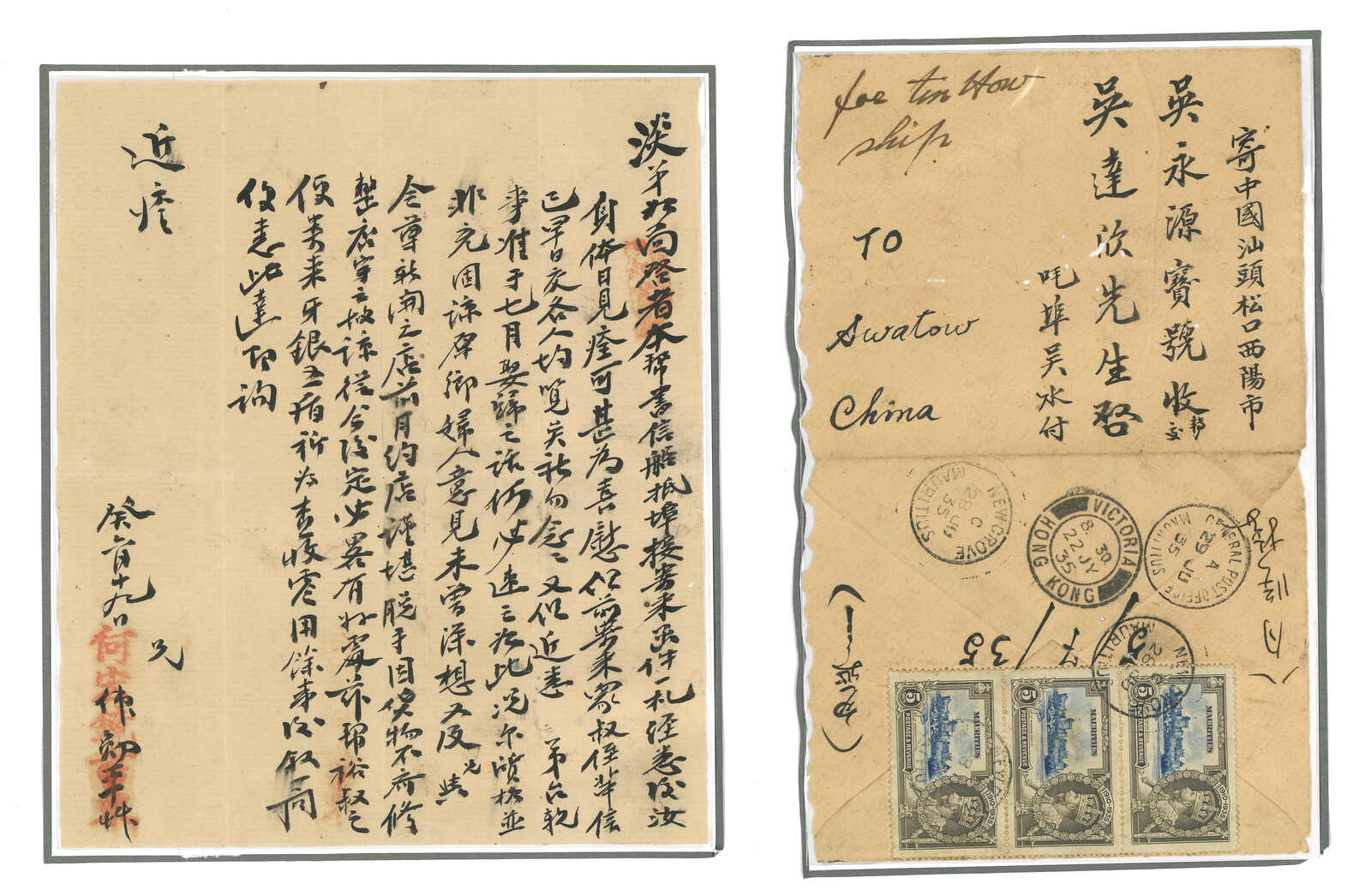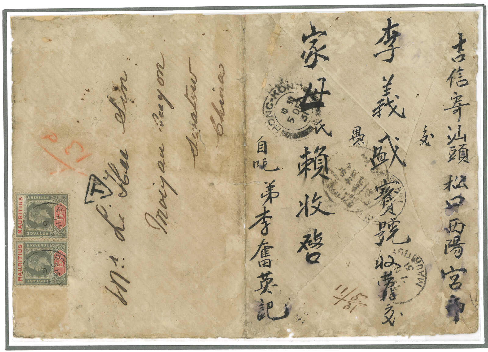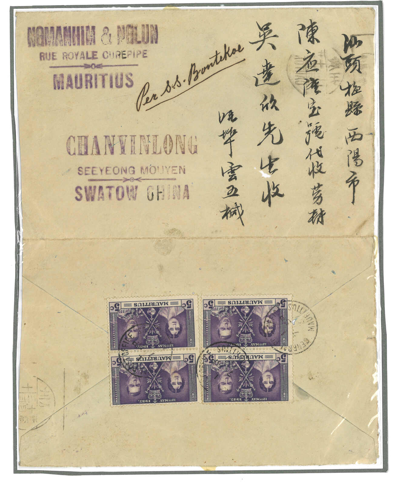 毛里求斯寄松口,貼毛里求斯佐治五世5分雙連。12.5經香港,同月經汕頭。少見之毛里求斯始發地。封剖開以作展示。(Image 1)