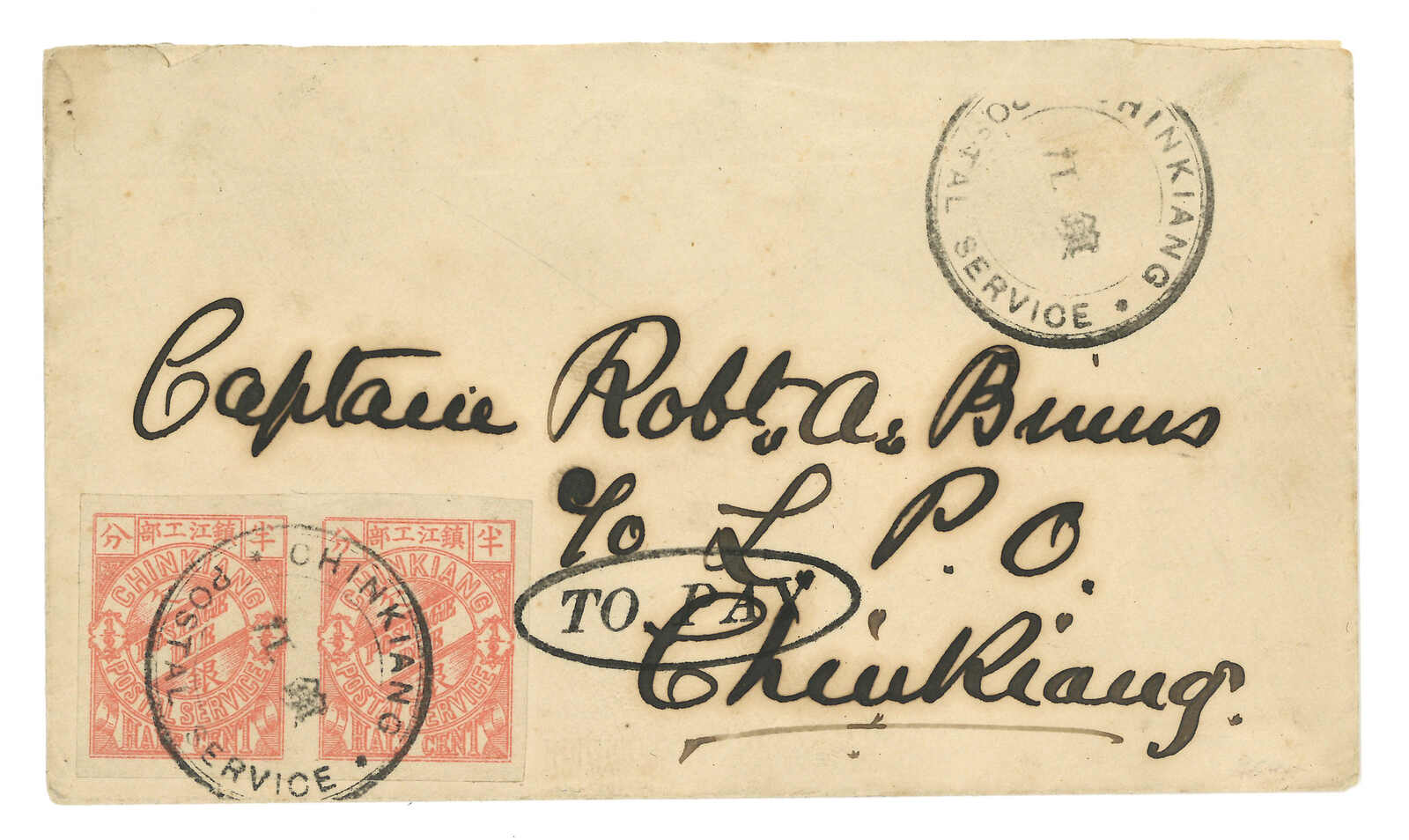 3238 cover imageca 1890s Cover to Captin Binns, Chinkiang, f.w. Chinkiang LPO litho postage due imperf 1/2c in pair (LCHD 33a), tied by "CHINKIANG / POSTAL SERVICE" circular seal in black. With F Z Chun name seal on reverse. Captain Binns was a famous stamp collector.