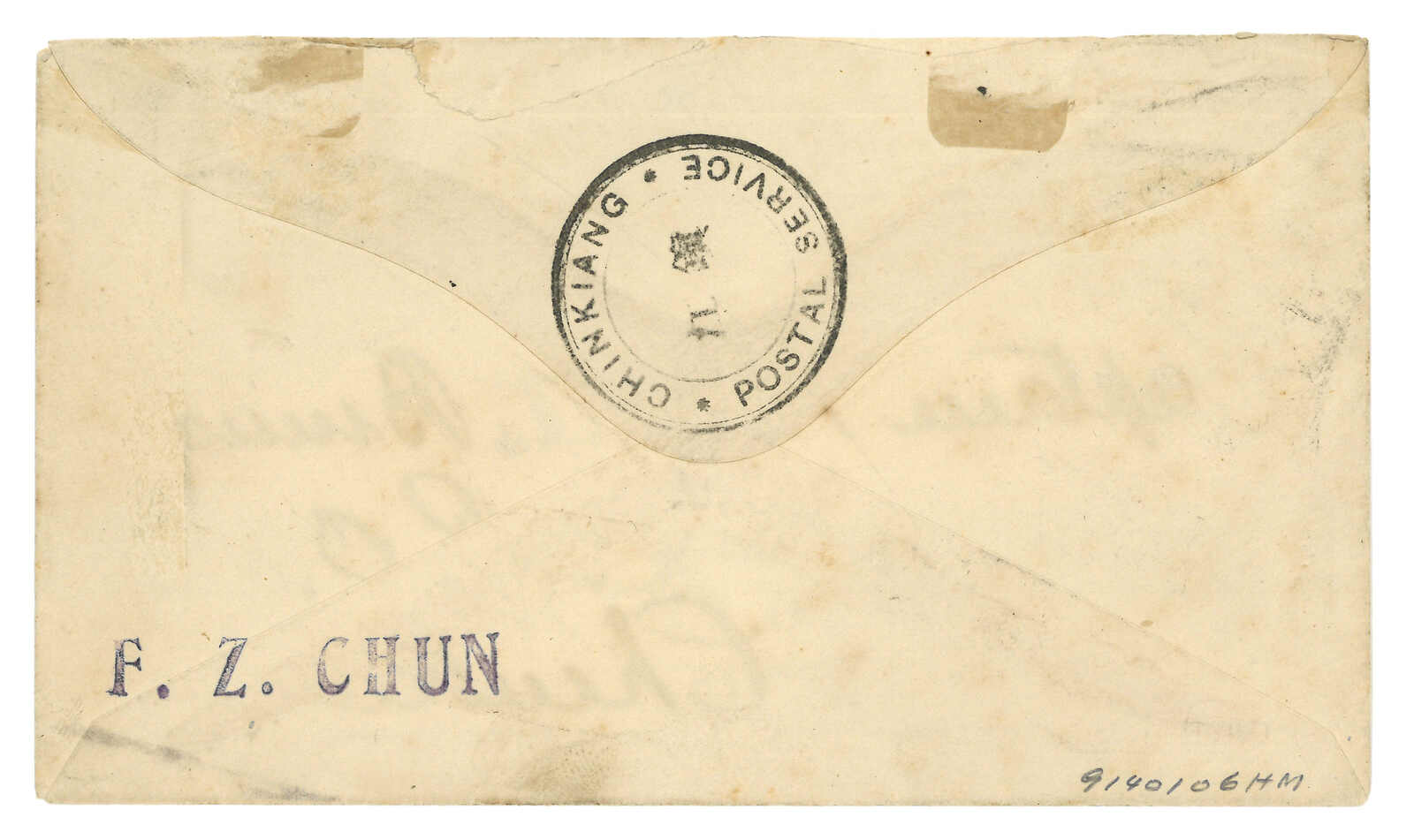 約1890年代經鎮江書信館寄Binns船長封,貼鎮江書信館石印欠資票無齒半分雙連(陳目LCHD33a),銷鎮江漢英黑色圓戳。背面帶陳復祥名字章。Binns船長為著名之集郵者。(Image 1) (Image 2)