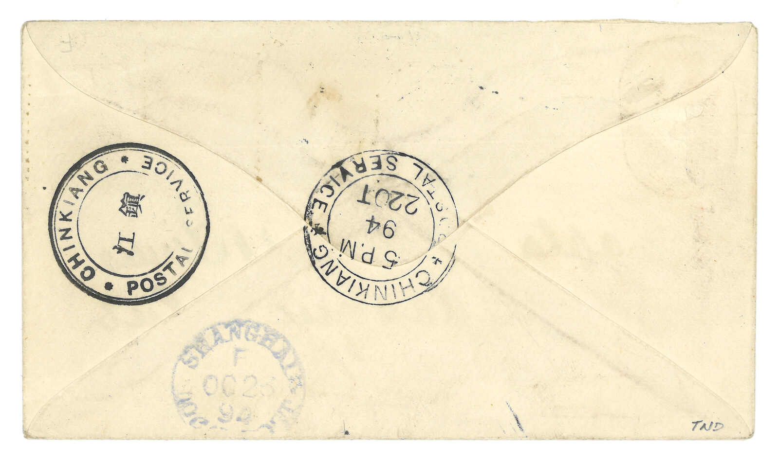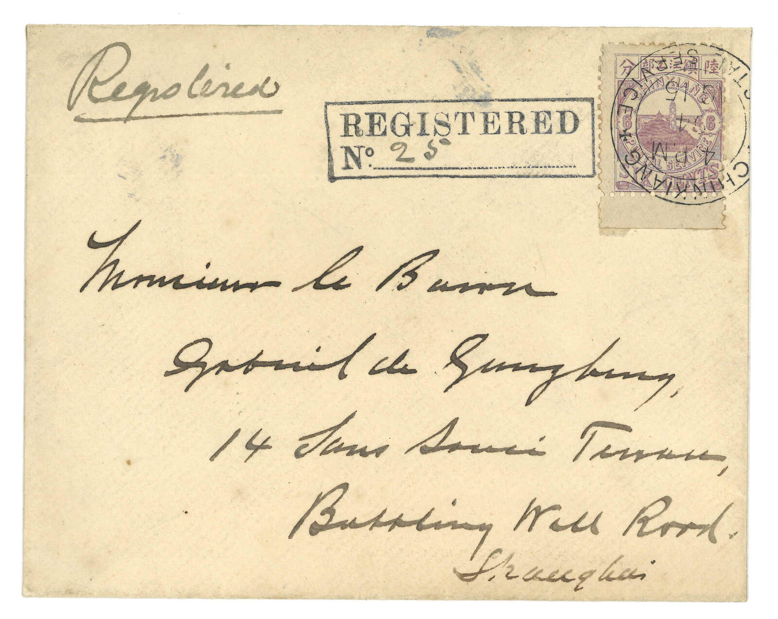 3239 cover image1894 Chinkiang (15 Aug) to Baron Gabriel de Gunzburg, Shanghai, f.w. Chinkiang LPO 1st issue 6c, tied by Chinkiang Postal Service cds, alongside with framed "REGISTERED" mark. Arrived Shanghai LPO (16 Aug). One of the two types of registered marks used by Chinkiang LPO.