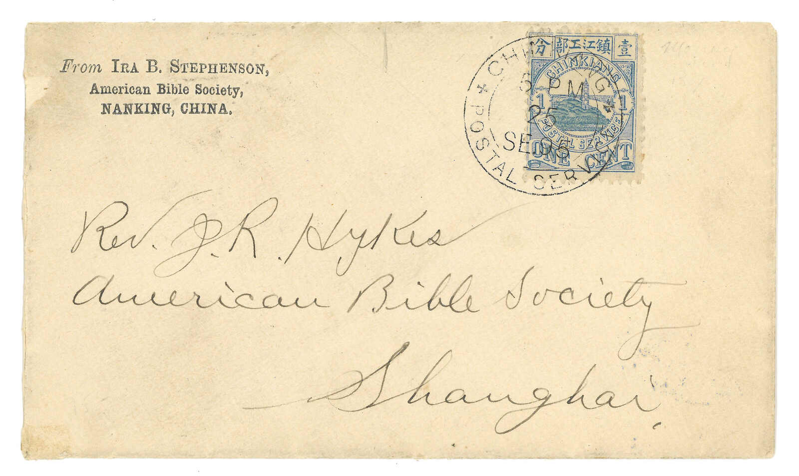 1895.9.25 美國聖經協會自南京經鎮江書信館寄上海,貼鎮江書信館第一版1分,銷鎮江郵政服務英文日戳。9.26抵上海工部郵局。(Image 1) (Image 2)