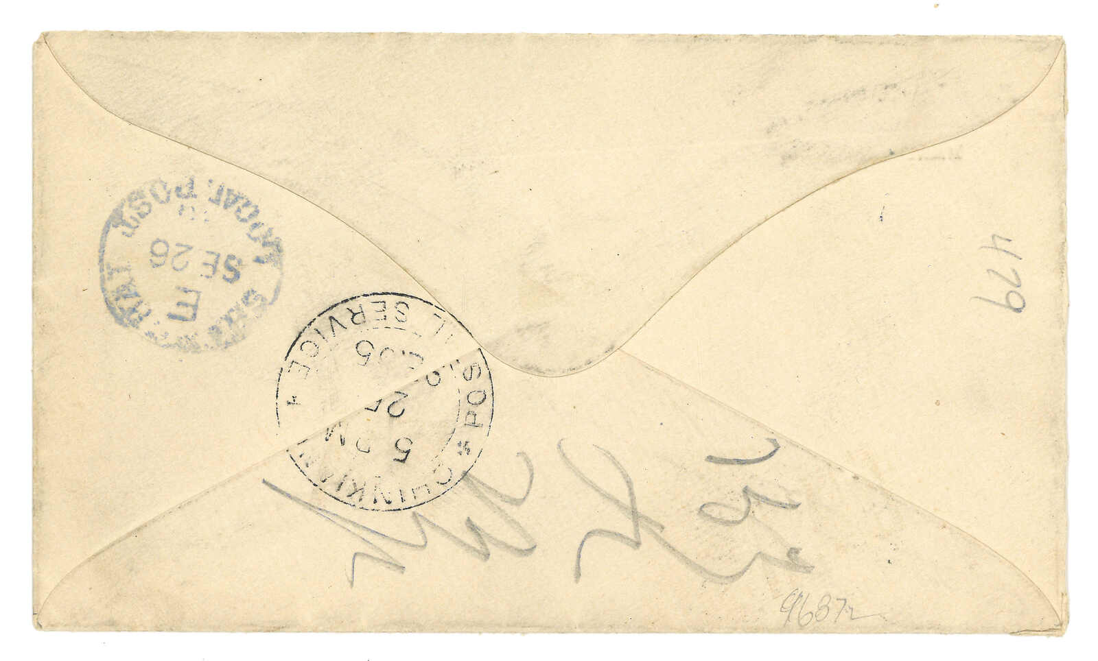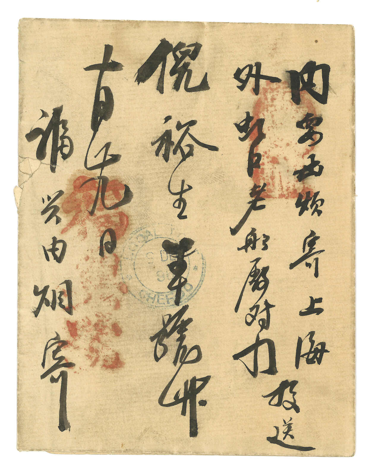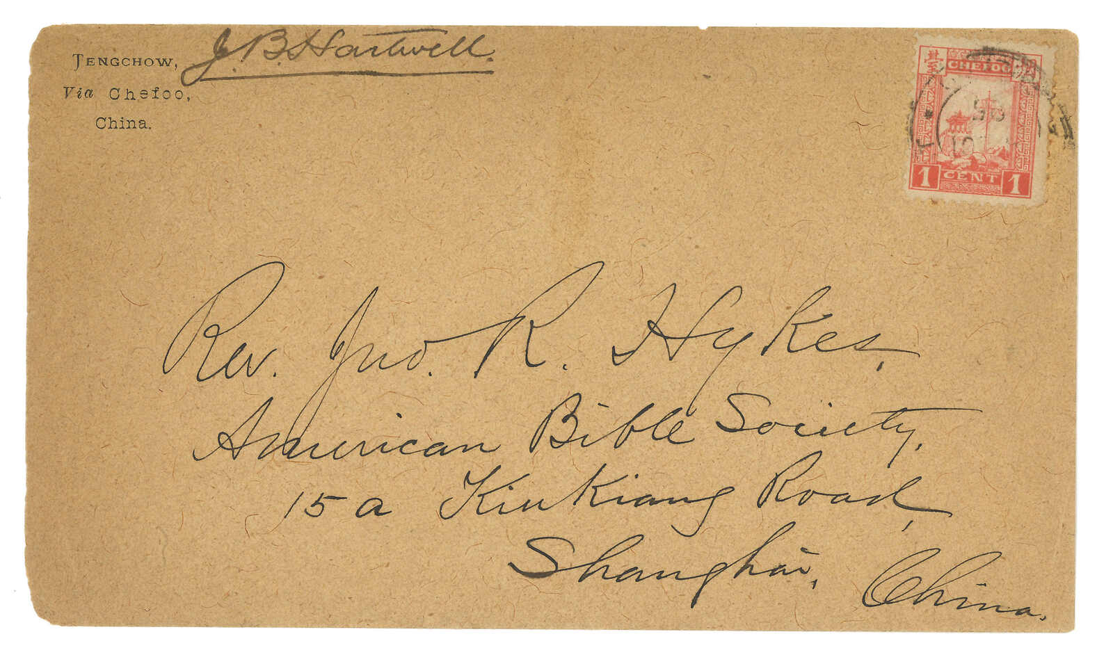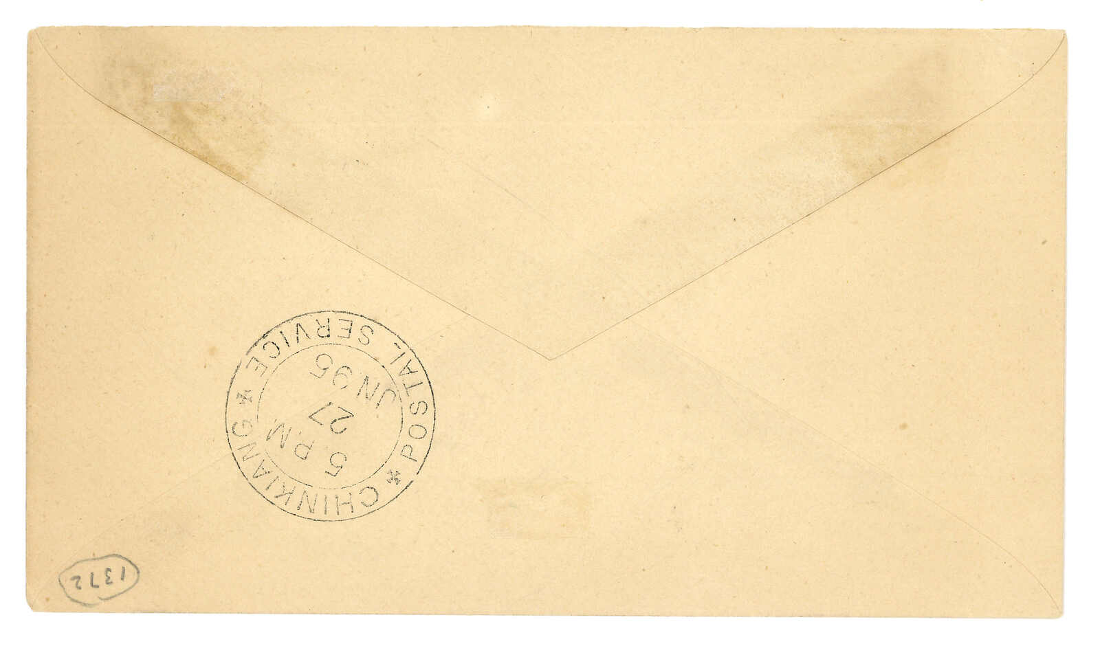 3242 cover image1895 (25 Sep) American Bible Society, Nanking to Shanghai via Chinkiang LPO, f.w. Chinkiang LPO 1st issue 1c, tied by "CHINKIANG POSTAL SERVICE" double-ringed cds. Arrived Shanghai LPO (26 Sep).