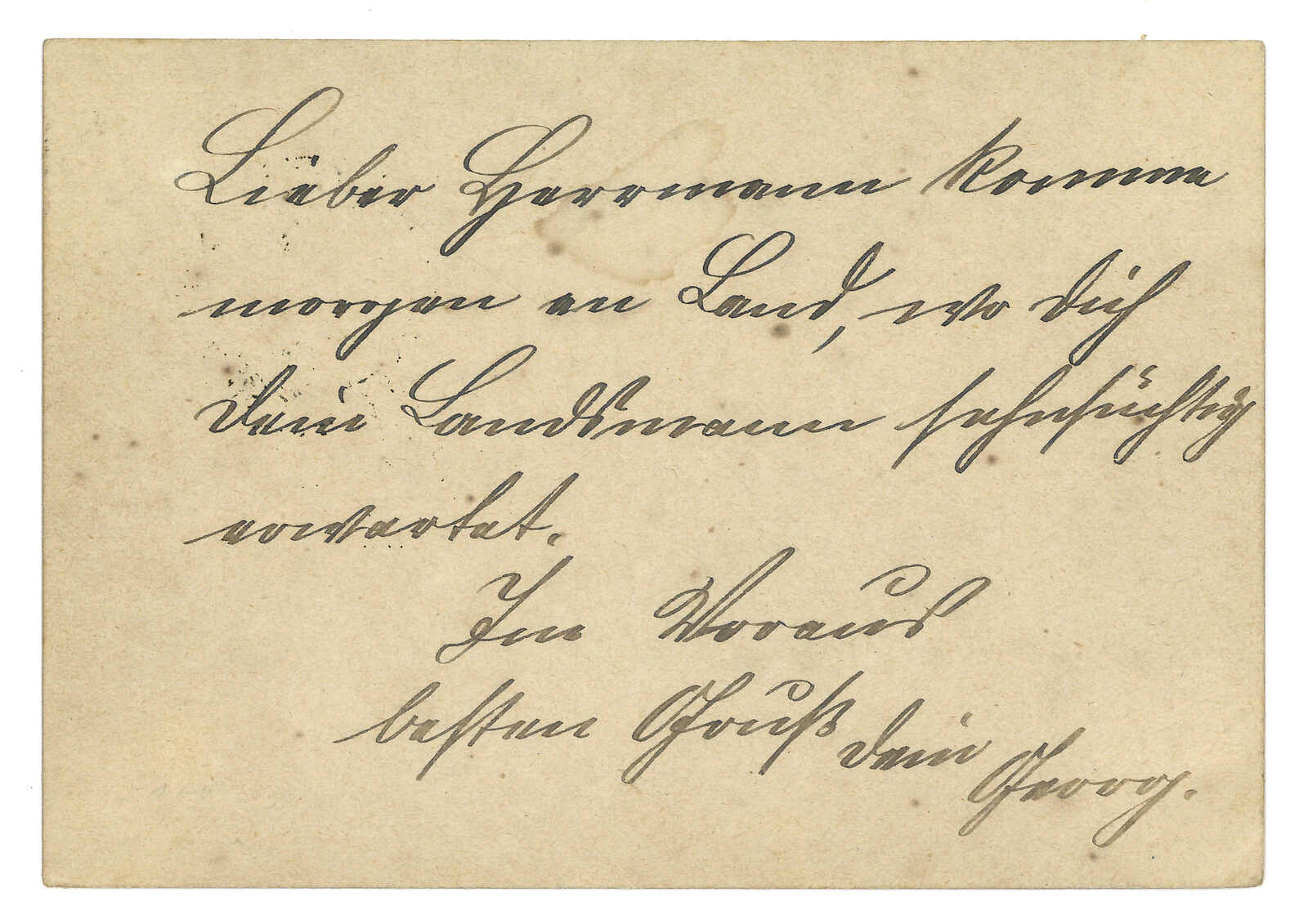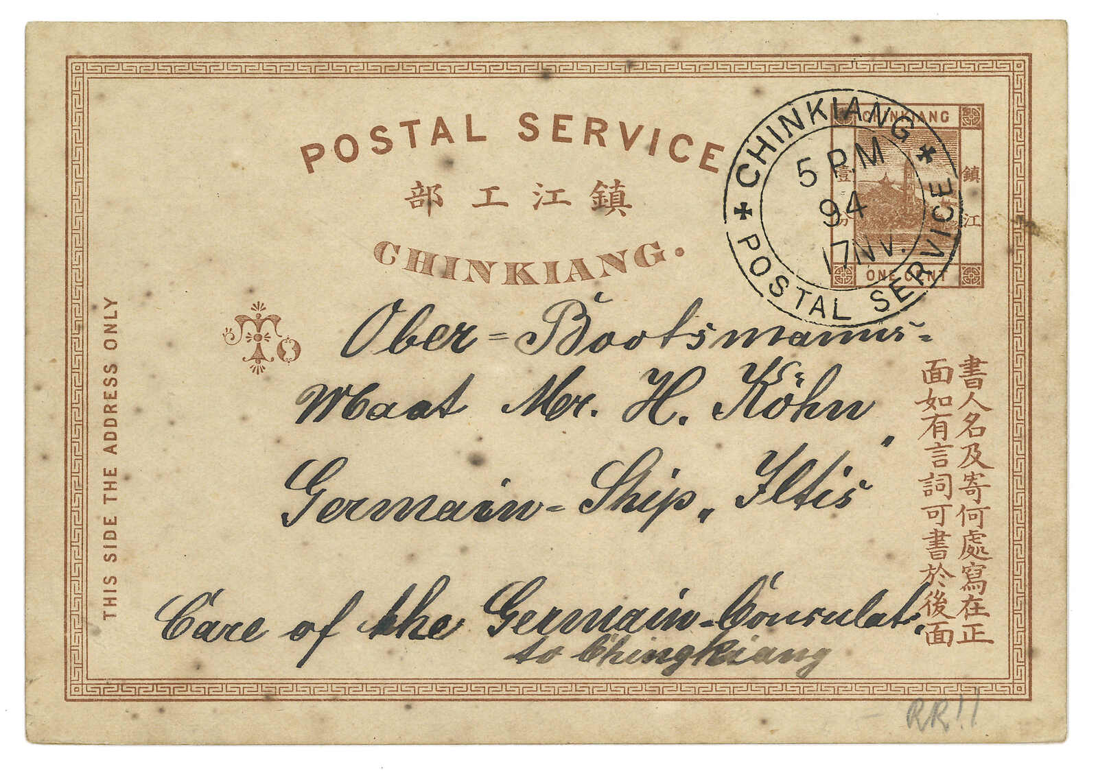 1894.11.17 鎮江書信館1分棕色郵資片經德國領事館寄德國戰艦Iltis號,銷鎮江郵政服務黑色日戳。棕色1分片發行於1894年10月4日,此為甚早之例子。此片發行僅3000張。(Image 1) (Image 2)