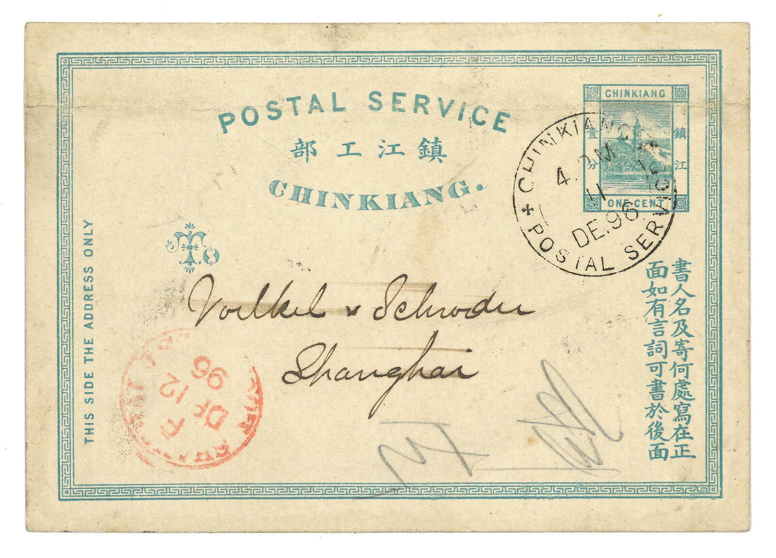 1896.12.11 鎮江書信館1分藍色郵資片寄上海,銷鎮江郵政服務黑色日戳。12.21抵上海工部郵局。(Image 1) (Image 2)