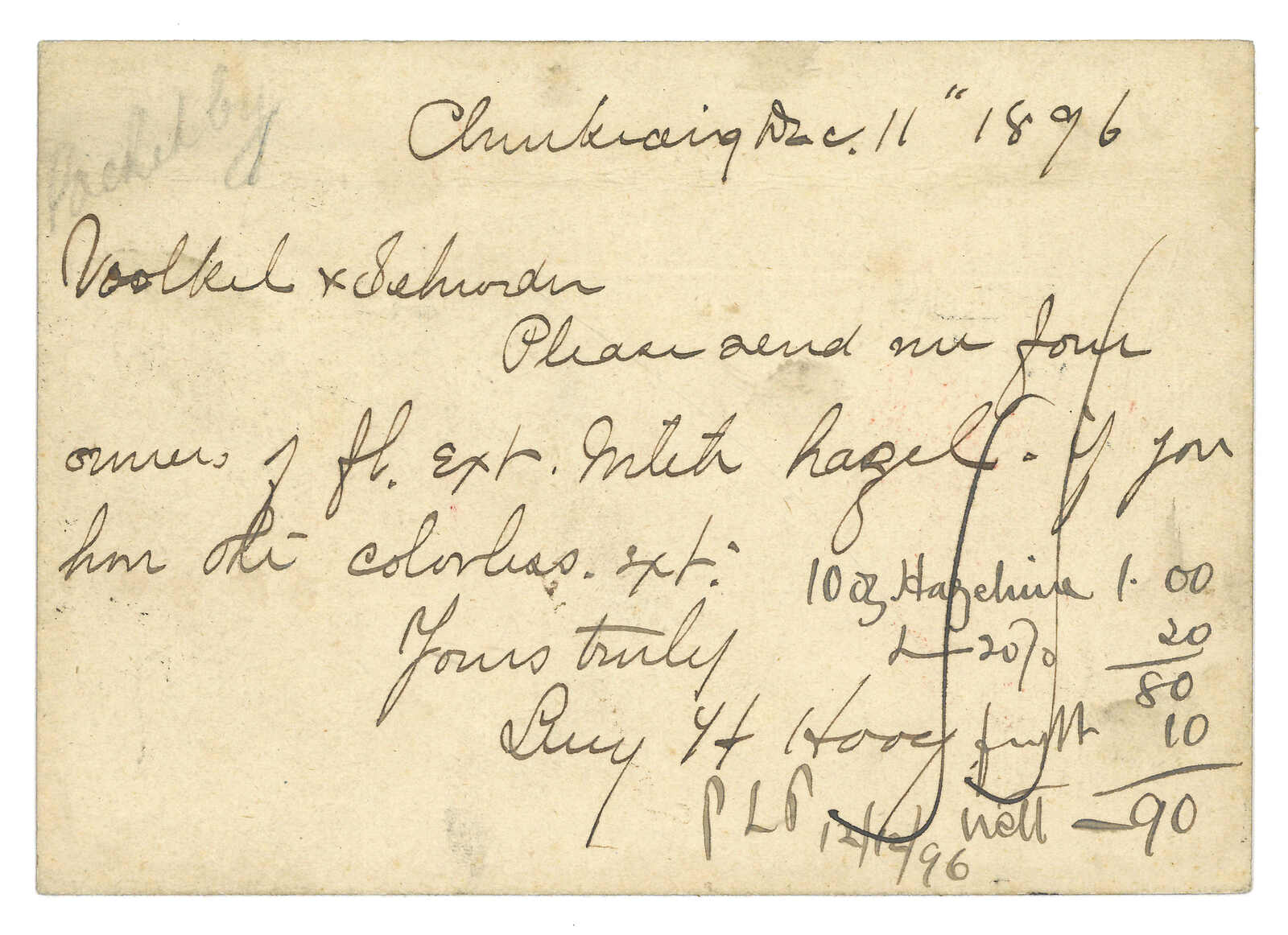 3251 cover image1896 (11 Dec) Chinkiang LPO 1c blue PSC to Shanghai, tied by Chinkiang Postal Service cds. Arrived Shanghai LPO (12 Dec).