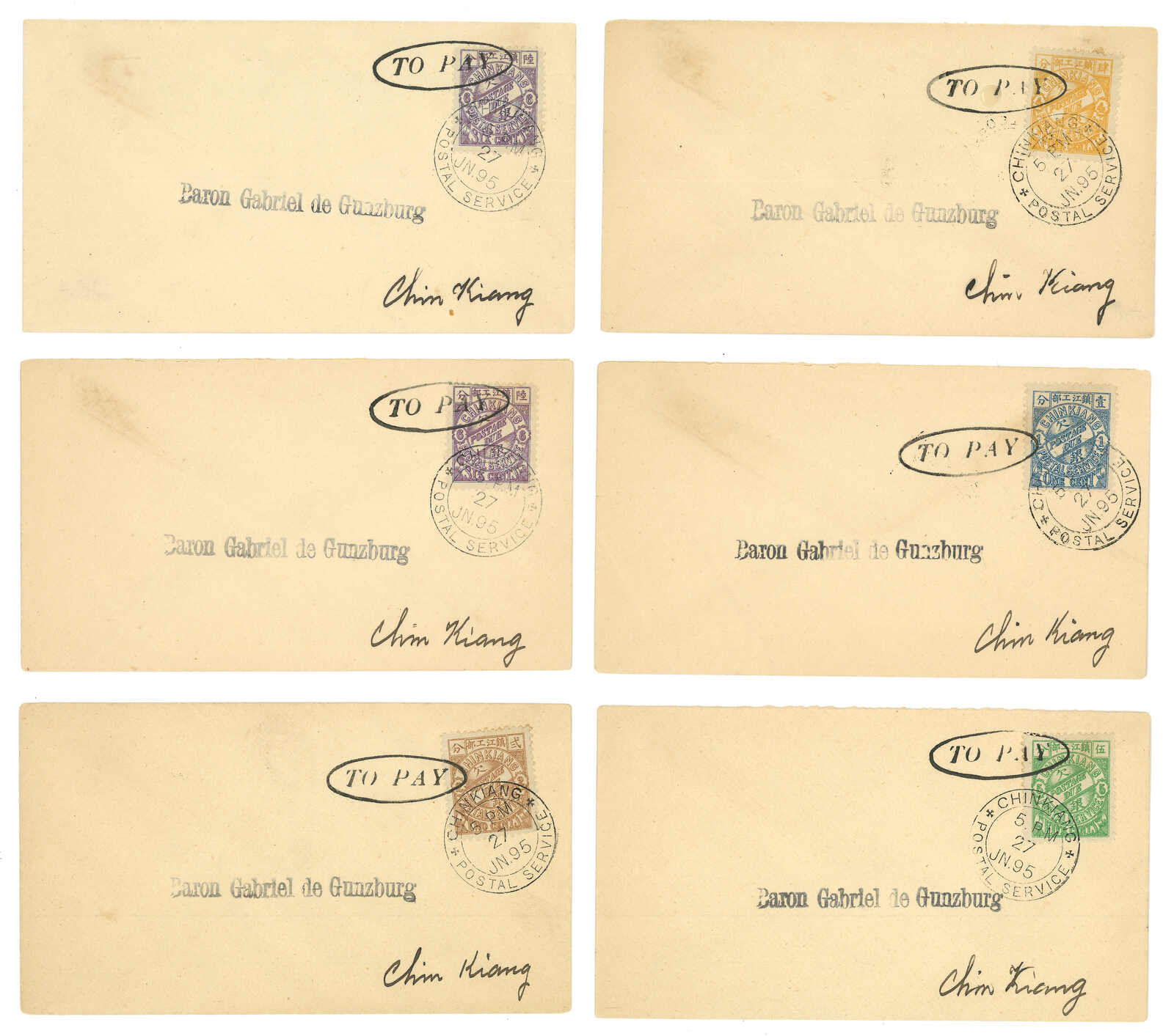 3244 cover image1895 a group of 6 Chinkiang LPO philatelic covers to Baron Gabriel de Gunzburg, f.w. Chinkiang LPO litho postage due singles, denominations from 1c to 6c, tied by Chinking Postal Service cds and/or oval "TO PAY" mark.