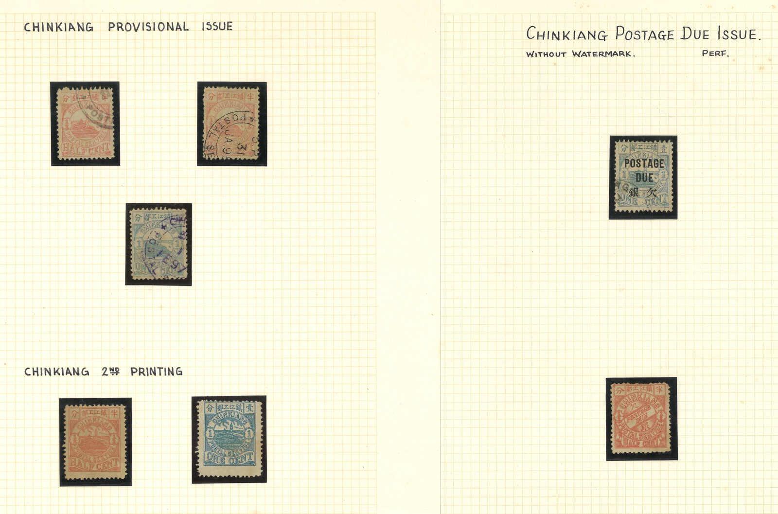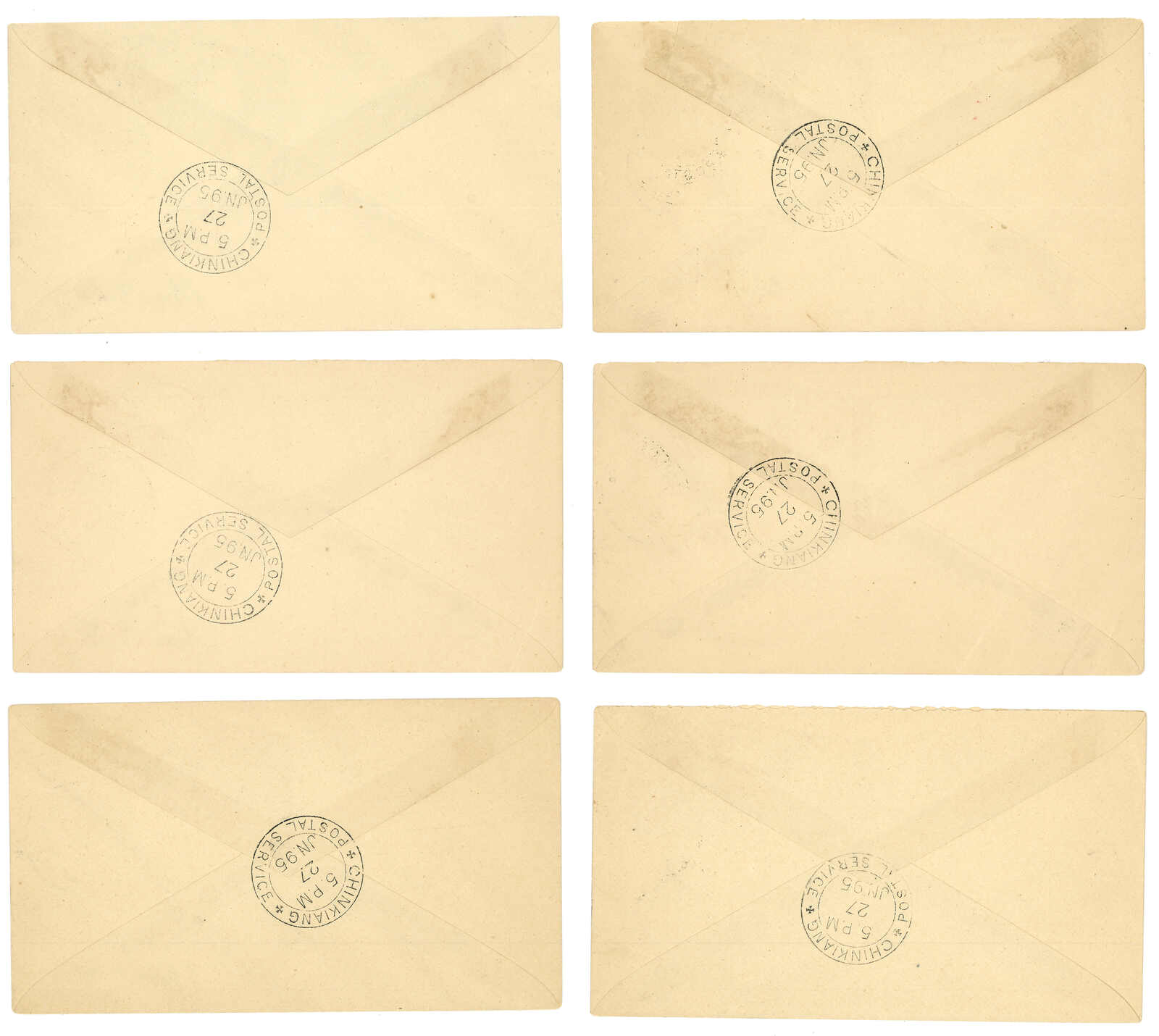1895年一組六件鎮江書信館集郵封,寄Baron Gabriel de Gunzburg,分別貼鎮江書信館石印欠資票單枚,面值由半分至6分,銷鎮江郵政服務日戳及橢圓TO PAY戳記。(Image 1) (Image 2)