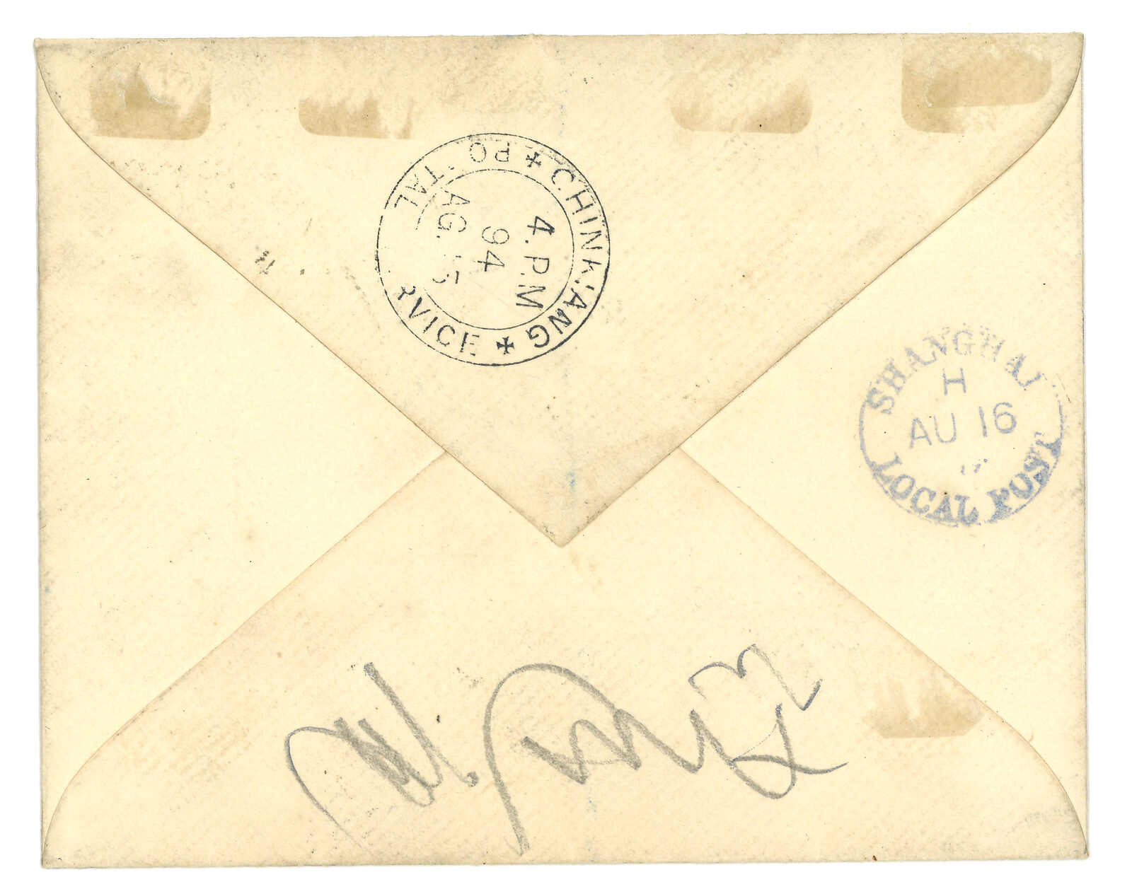 3240 cover image1894 Chinkiang (22 Oct) to Captin Binns, Shanghai. Registered cover, f.w. Chinkiang LPO 1st issue 1c in pair + 2c in pair, tied by "CHINKIANG POSTAL SERVICE" cds., alongside with R mark, PAID mark and framed registered mark. On reverse with another type of Chinkiang LPO bilingual circular seal. Arrived Shanghai LPO (23 Oct).