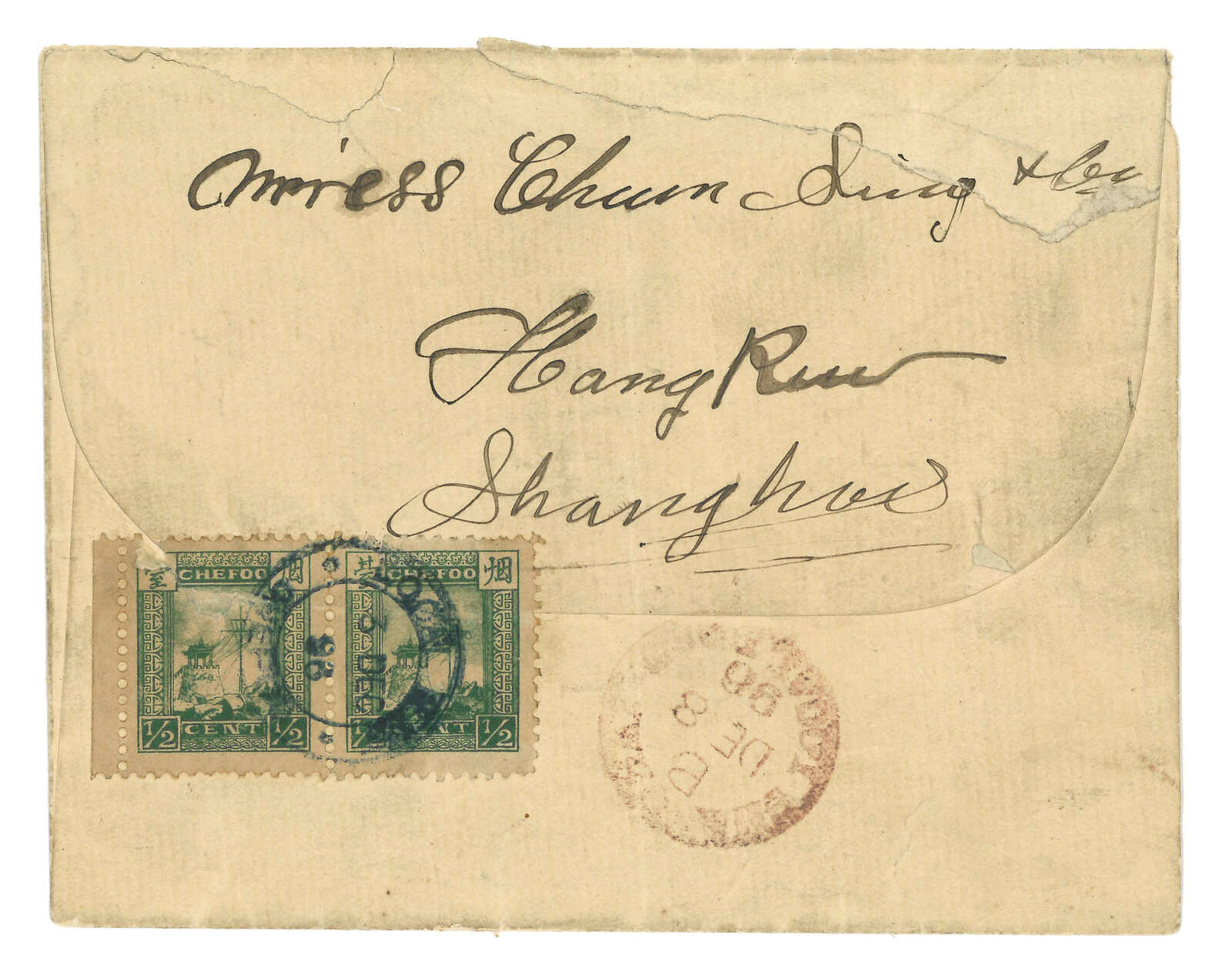 1896.12.3 煙台寄上海,貼煙台書信館第二版半分雙連,銷煙台書信館英文日戳。12.8抵上海工部郵局。出色之實寄例子。(Image 1) (Image 2)