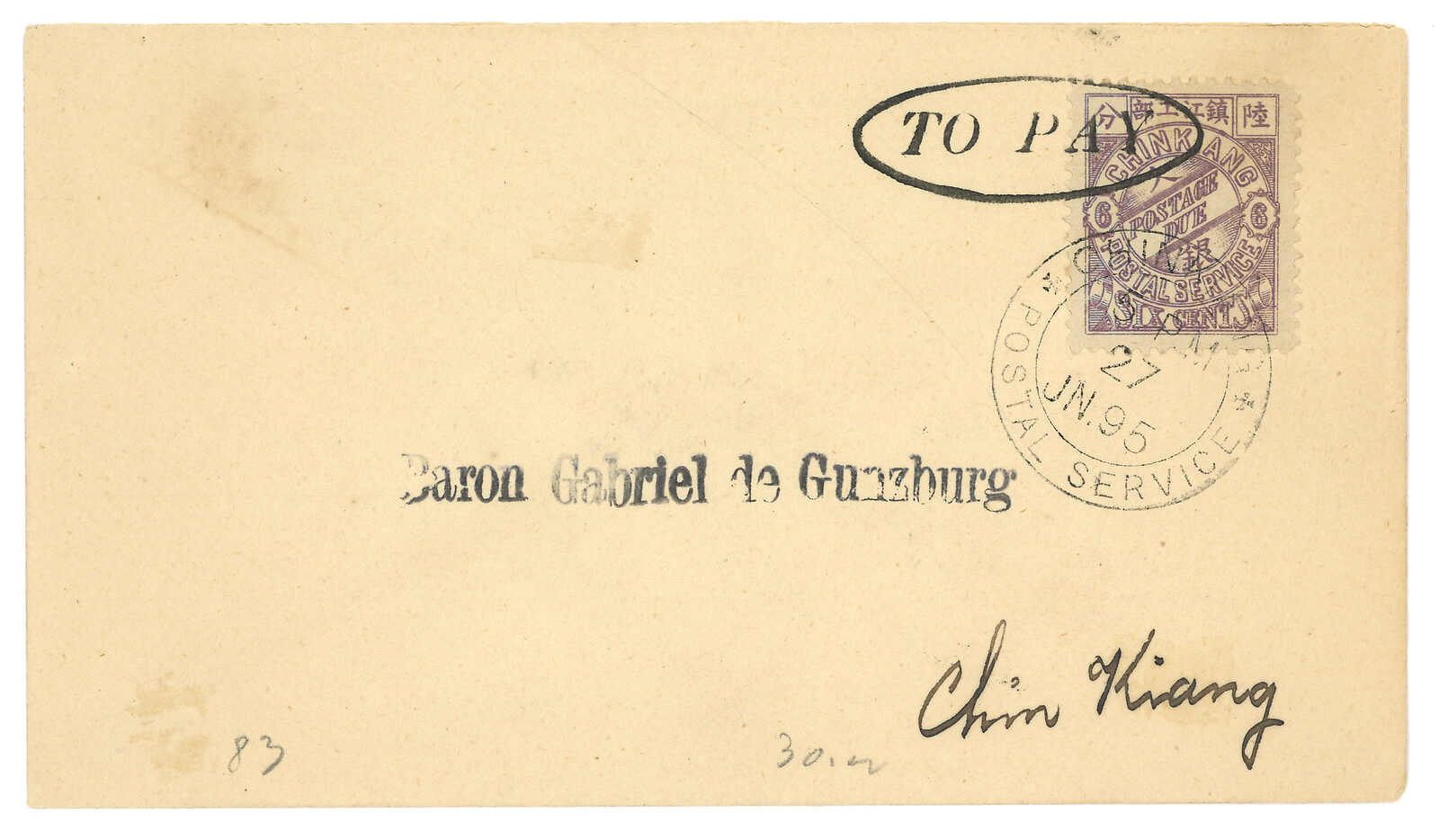 1895.6.27 鎮江本埠,寄Baron Gabriel de Gunzburg, 銷鎮江書信館石印欠資票6分銷,鎮江郵政服務英文日戳 及“TO PAY”橢圓形戳記。(Image 1) (Image 2)