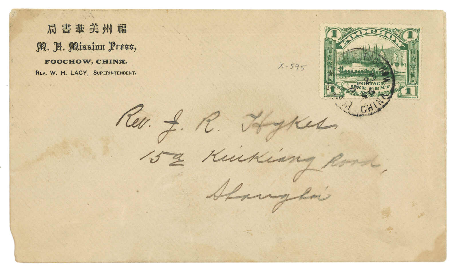 3260 cover image1896 Foochow (23 Sep) to Shanghai, f.w. Foochow LPO 1c, tied by "Postal Service Foochow" cds. Arrived Shanghai LPO (27 Sep).