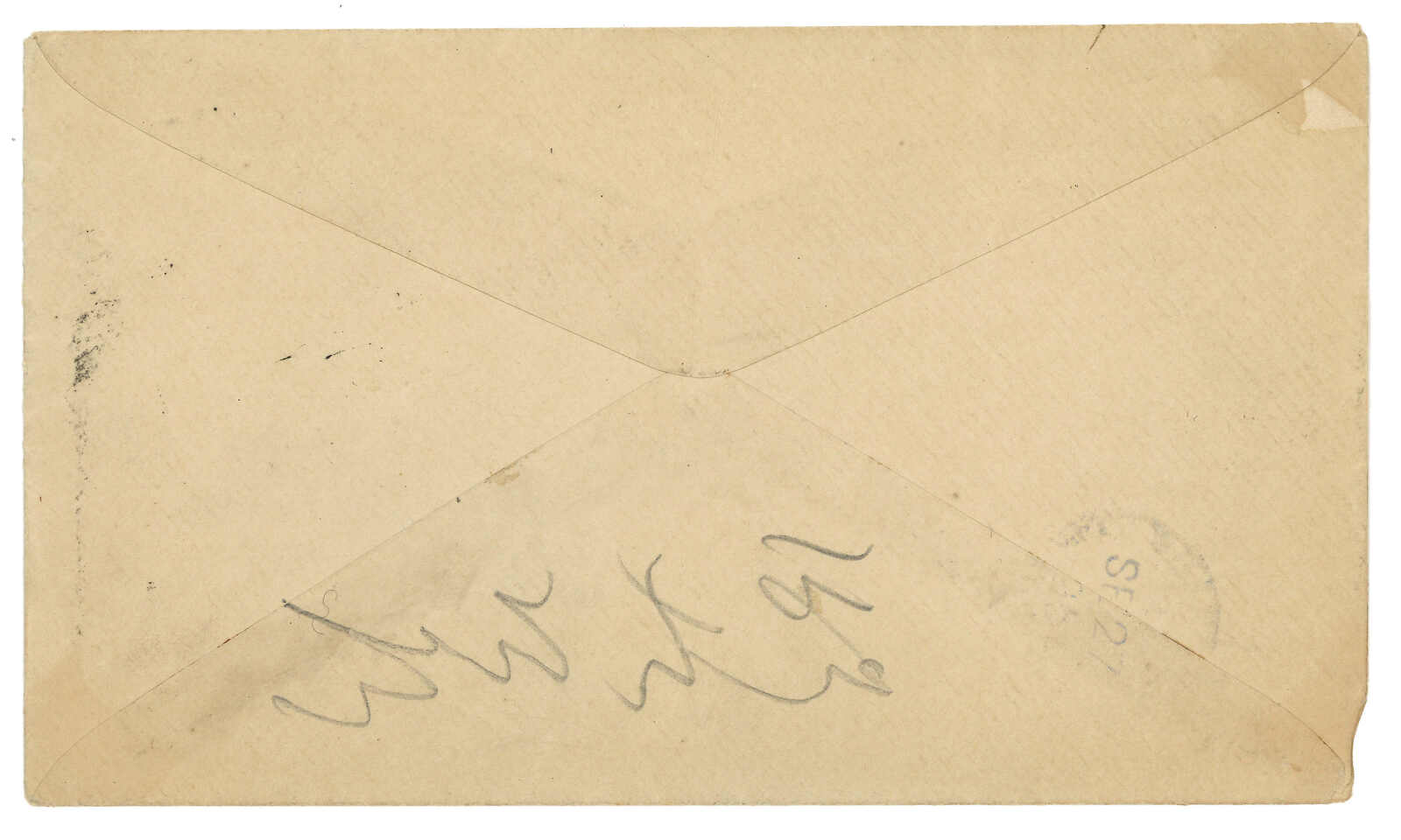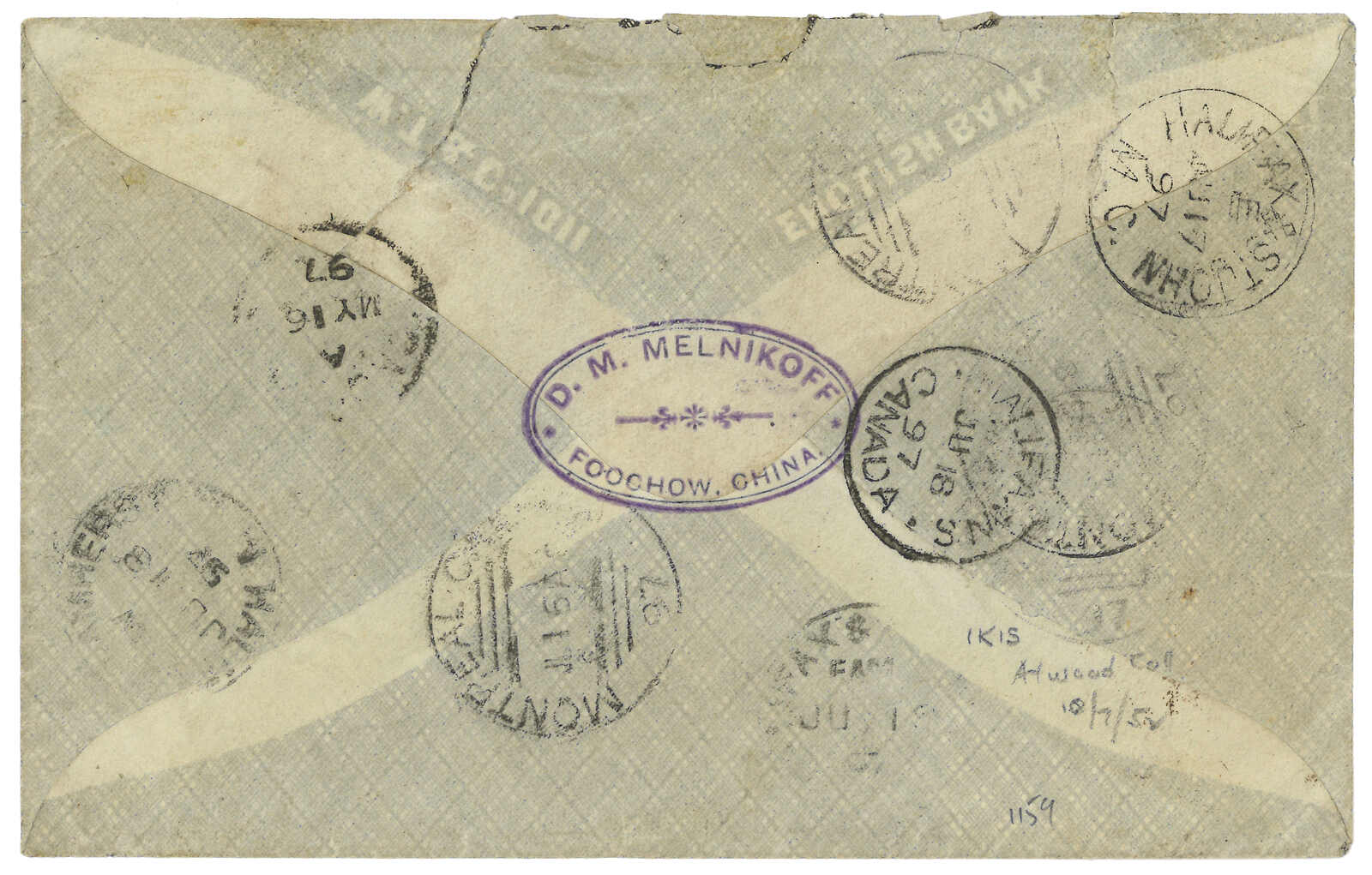 101 cover image1897 (13 May) “D. Melnikoff, Foochow, China” registered cover to Nova Scotia, f.w. Empress Dowager surch small figure 10c/12ca x3, tied by Customs Foochow cds, alongside with R mark. In combination with Hong Kong QV 10c in strip of 3, tied by Hong Kong (16 May) cds. Little roughly opened at top, nevertheless a very fine and outstanding registered double rate usage from Foochow. Chan 45. Provenance: Dr. Warren G. Attwood, Harmer, Rooke & Co. (New York) 7.10.1952, lot 131, Christoper D’Almada, Christie’s Robson Lowe (Zurich) 29.11.1990, lot 1159, Anna Lisa and Sven-Eric Beckham, Sotheby’s and Corinphila (Hong Kong), 14.5. 1998, lot A120 References: Tony To-Wah Kwan, ed., Covers and Cards of Empress Dowager Jubilee and its Surcharged Issues. Volume Two: Surcharged Issues Covers and Cards-1897 (Hong Kong, 2011), p. 695. Illustrated.