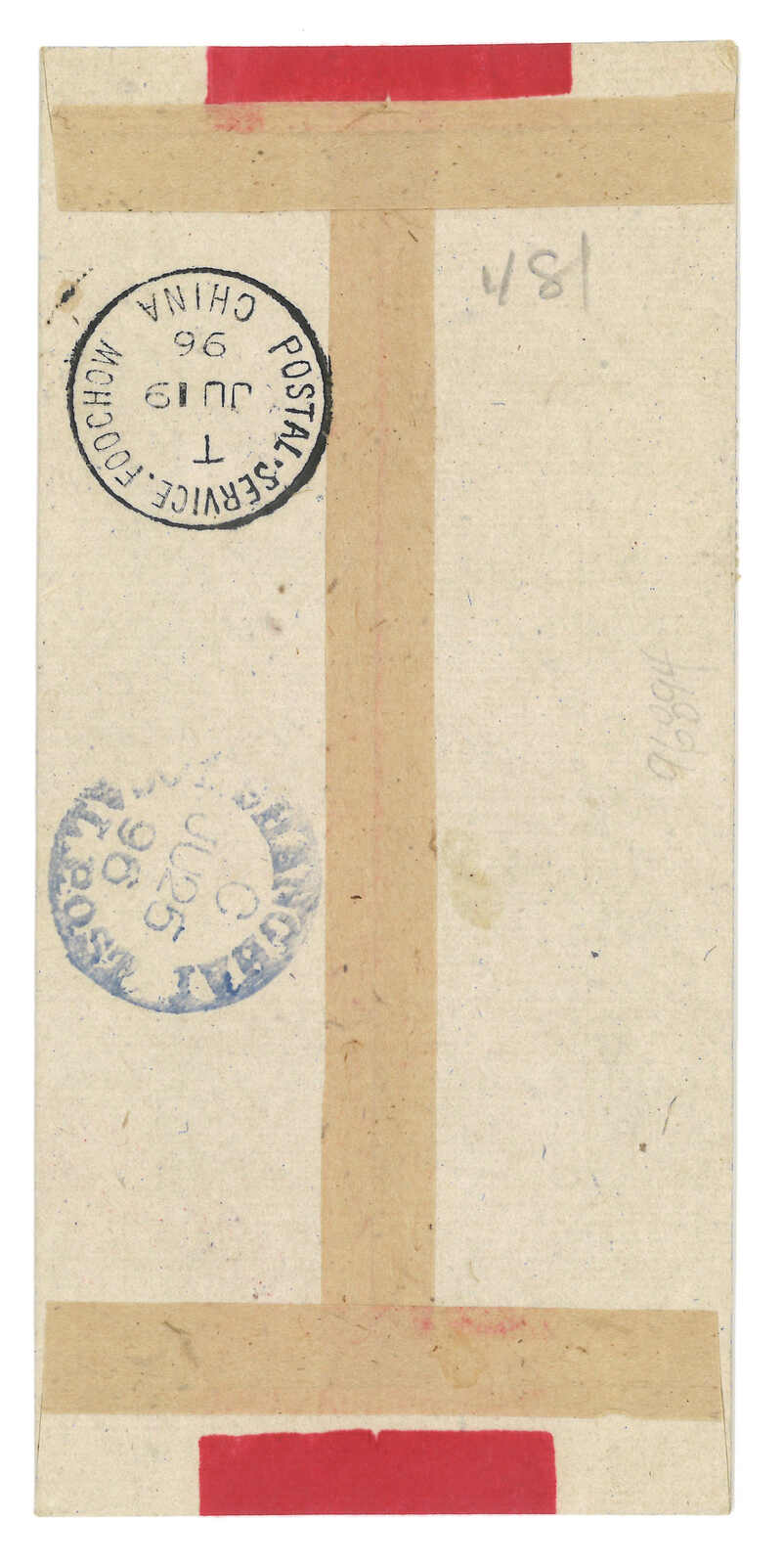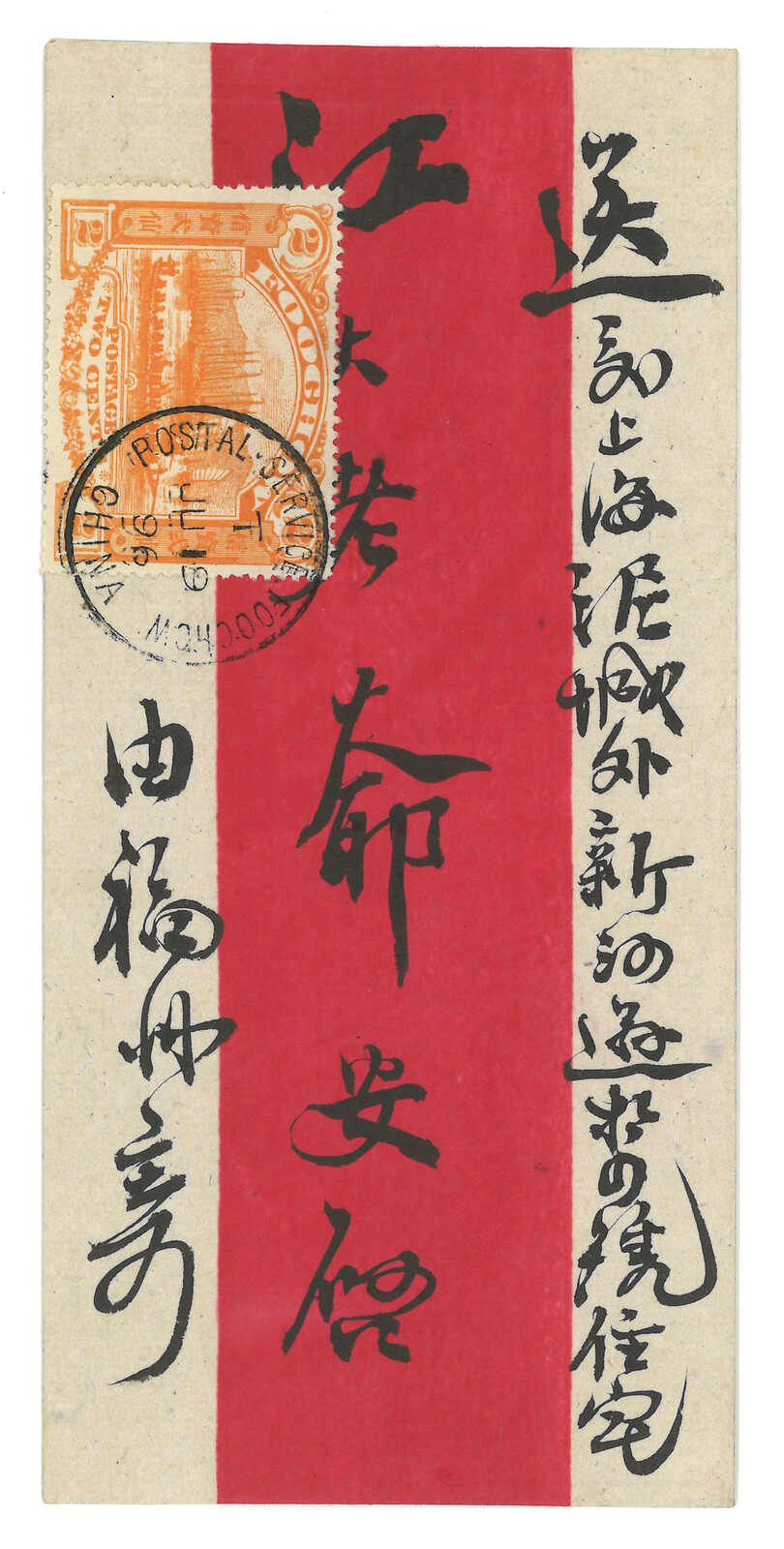 3259 cover image1896 Foochow (19 Jun) to Shanghai. Red band cover, f.w. Foochow LPO 2c, tied by "Postal Service Foochow" cds. Arrived Shanghai LPO (26 Jun).