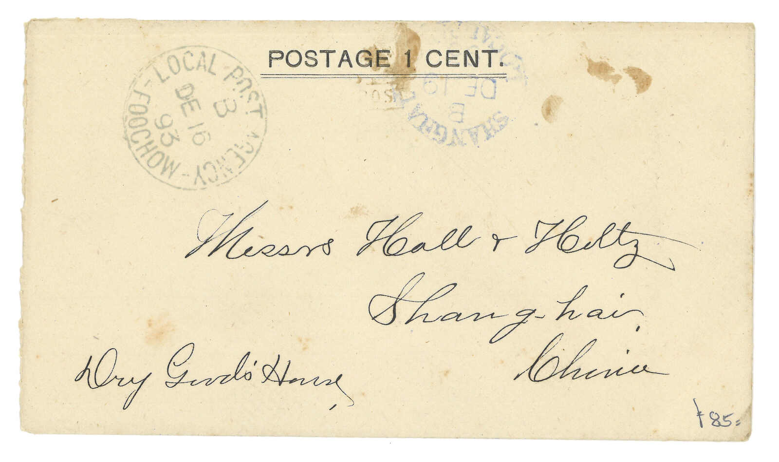 3258 cover image1893 (16 Dec) Shanghai LPO 1c stationery cover from Foochow to Shangnhai, frankless and applied with "LOCAL POST AGENCY / FOOCHOW" cds. Arrived Shanghai LPO (19 Dec). Example of subscription system in Foochow, the date of 1893 is also early.