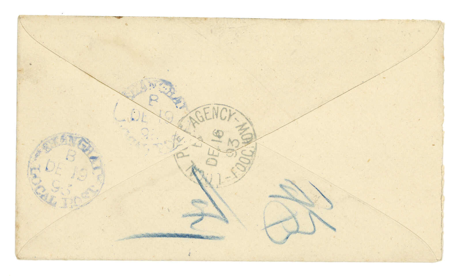 1893.12.16 上海工部郵局1分郵資封自福州寄上海,鈐“LOCAL POST AGENCY / FOOCHOW”日戳。12.19抵上海工部郵局。為福州書信館訂戶例子,1893年亦甚早。(Image 1) (Image 2)